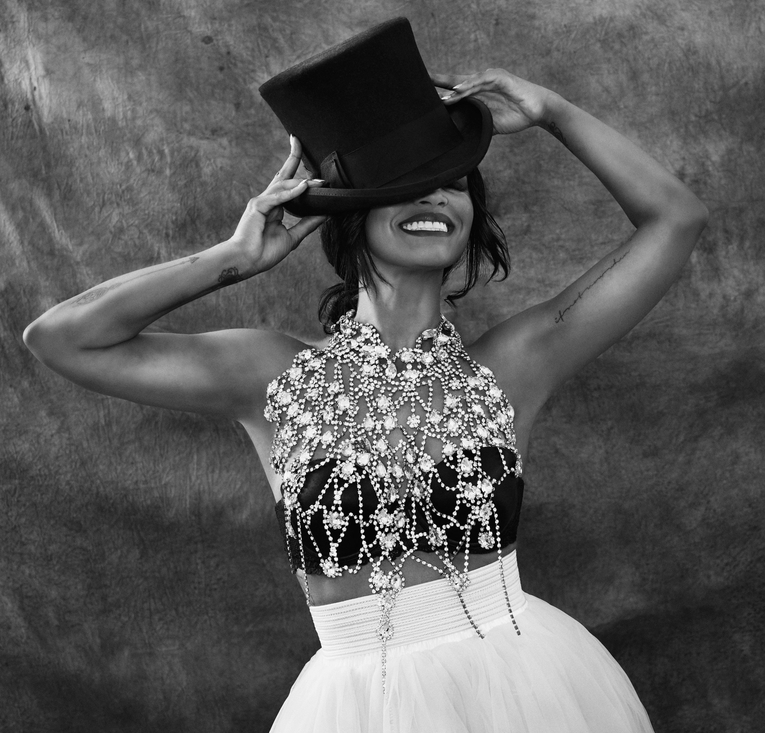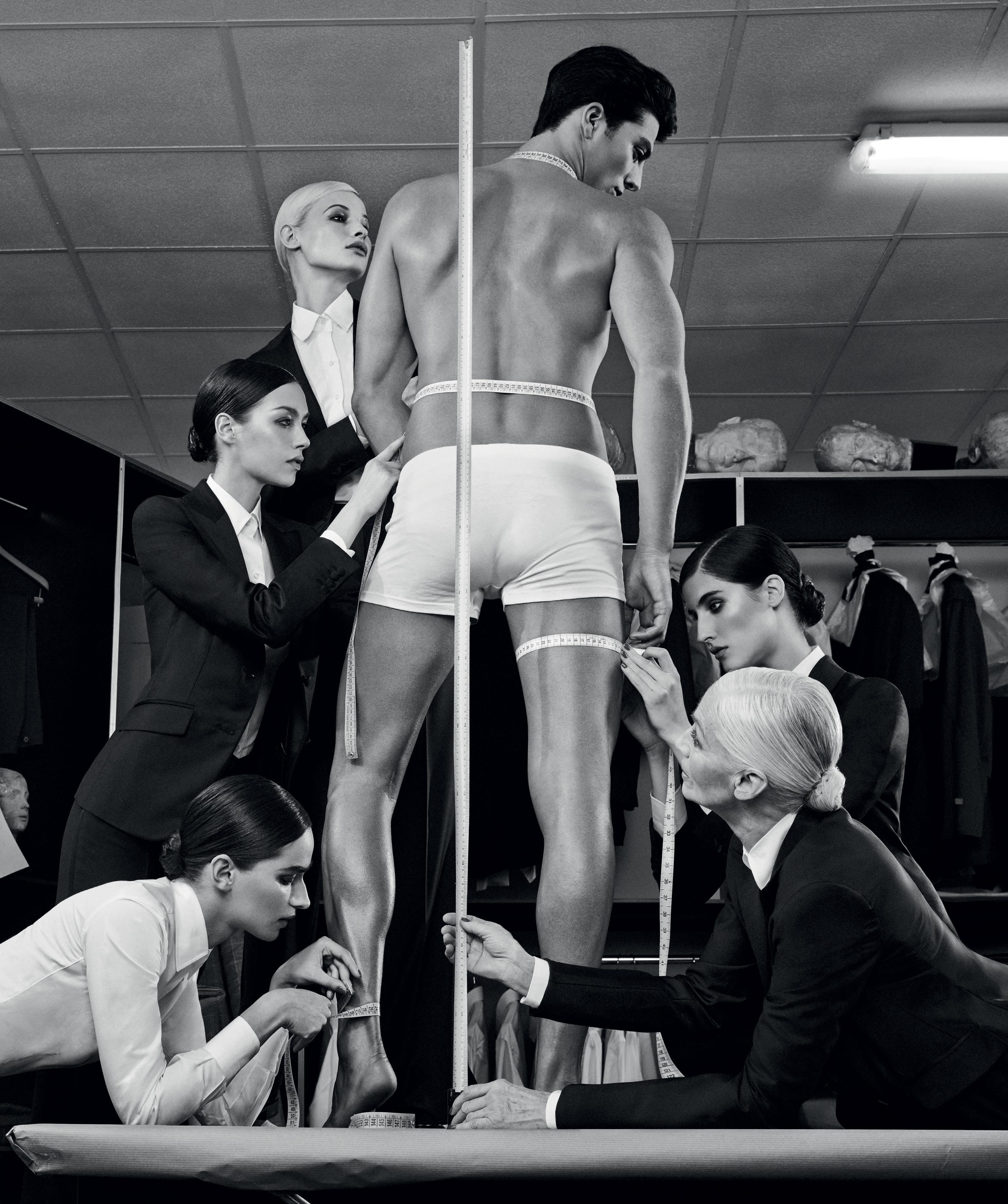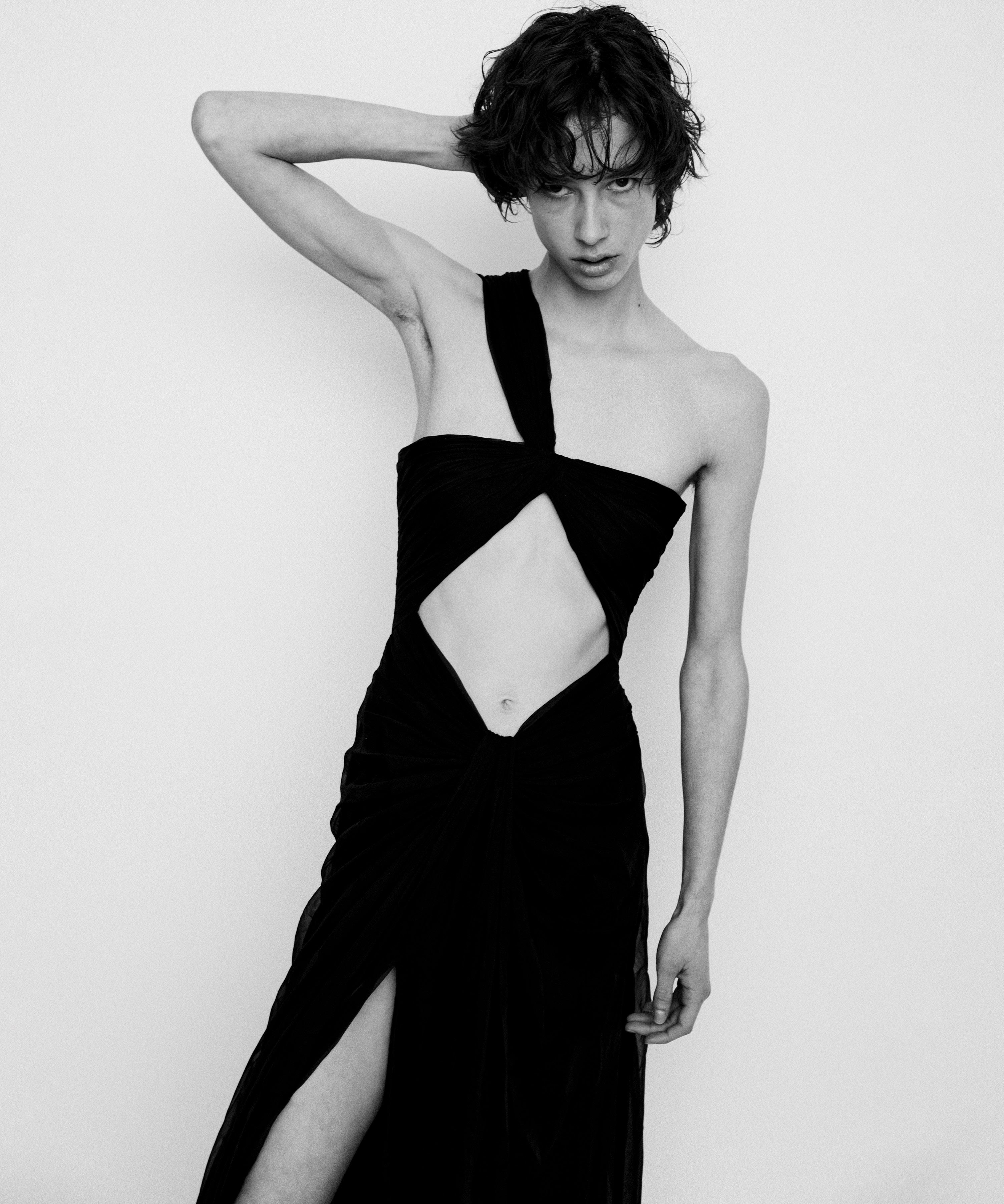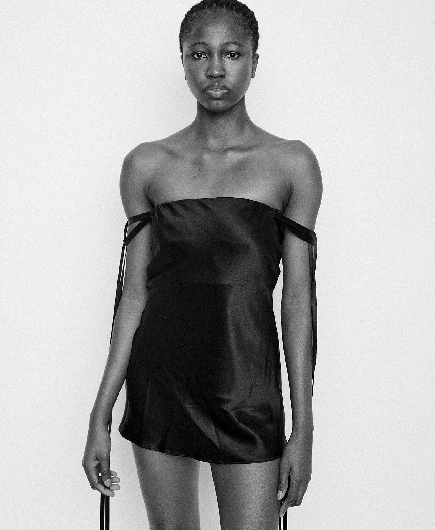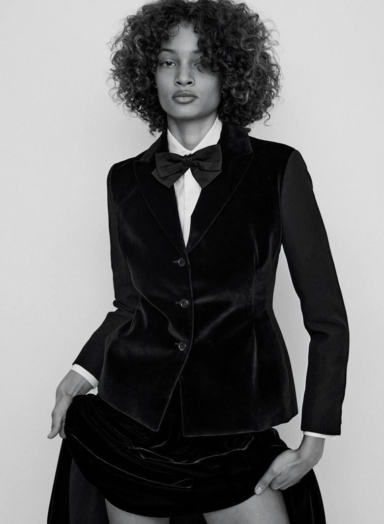 with a long obi-style bow, the first design from Christian Dior’s eager new assistant, Yves Saint Laurent. The juxtaposition of Dovima’s sinuous pose against the craggy-skinned, majestic elephants perfectly mirrored the juxtaposition of the white bow against the stark black dress. The photograph appears as a still from a choreographed dance between the beauty and beasts.