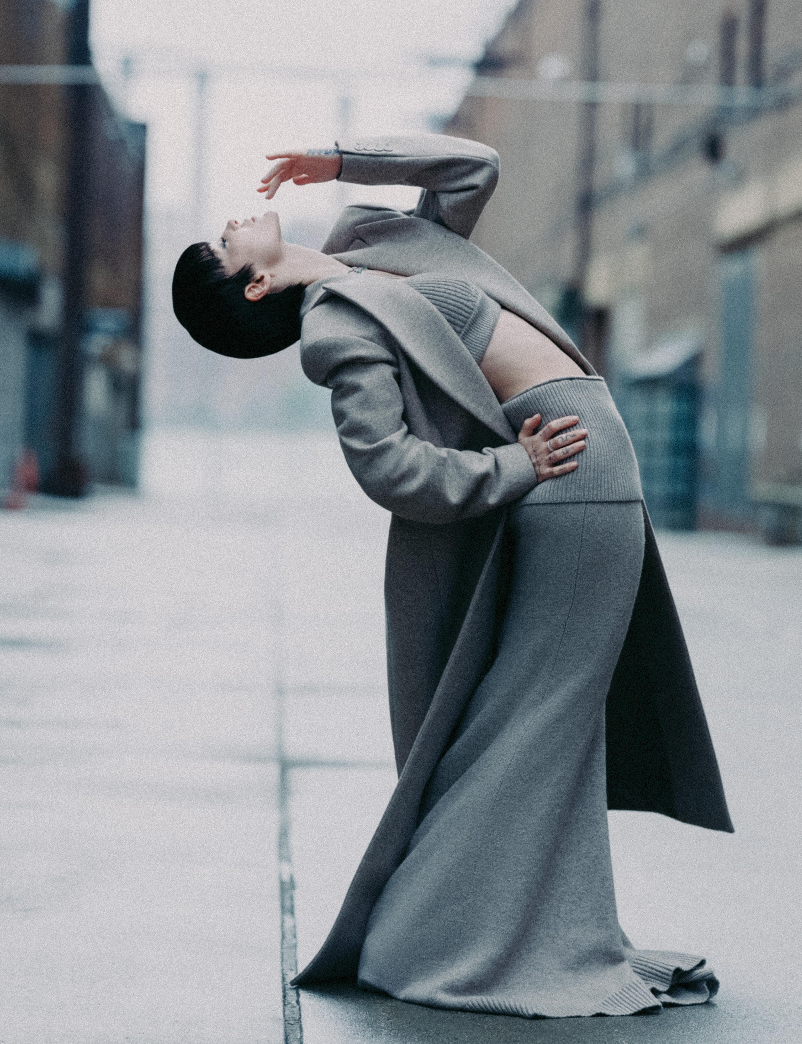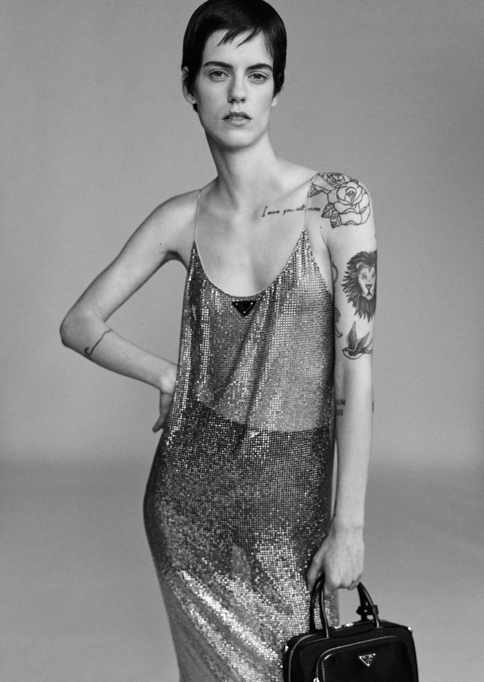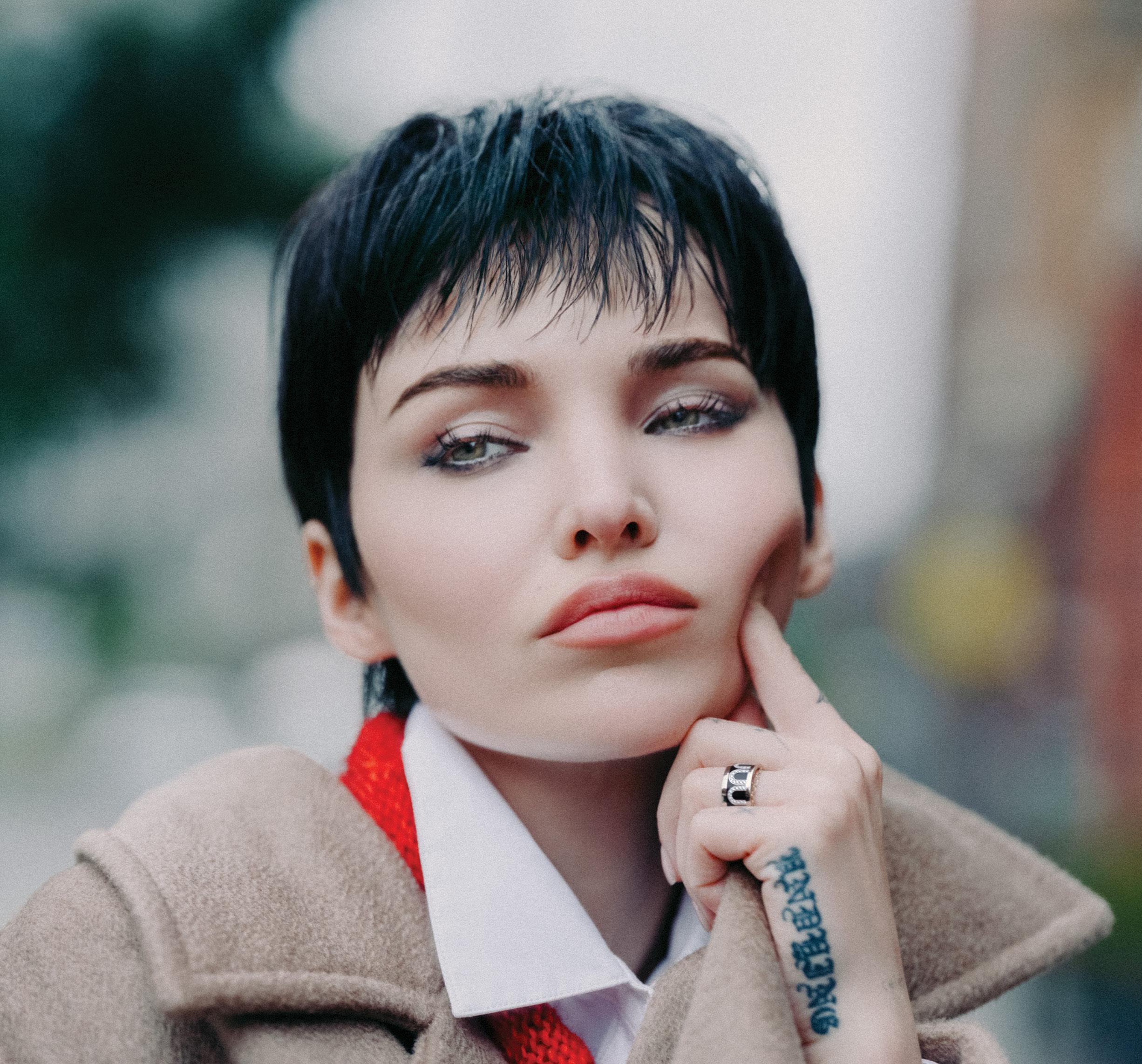 Emma Corrin, in Miu Miu, at the Miu Miu show in Paris