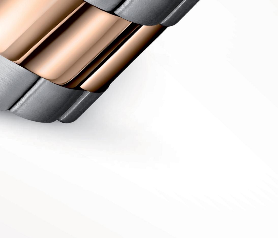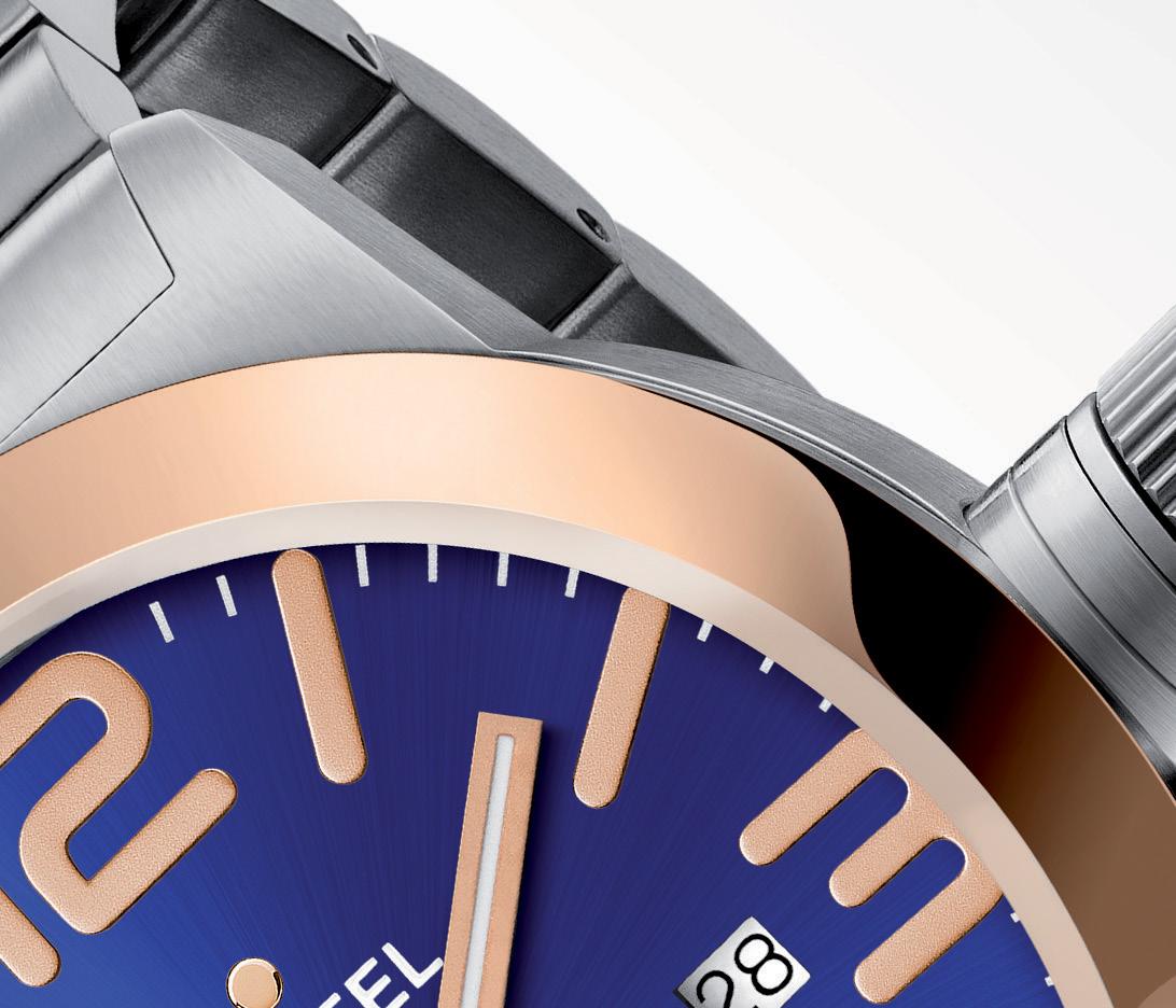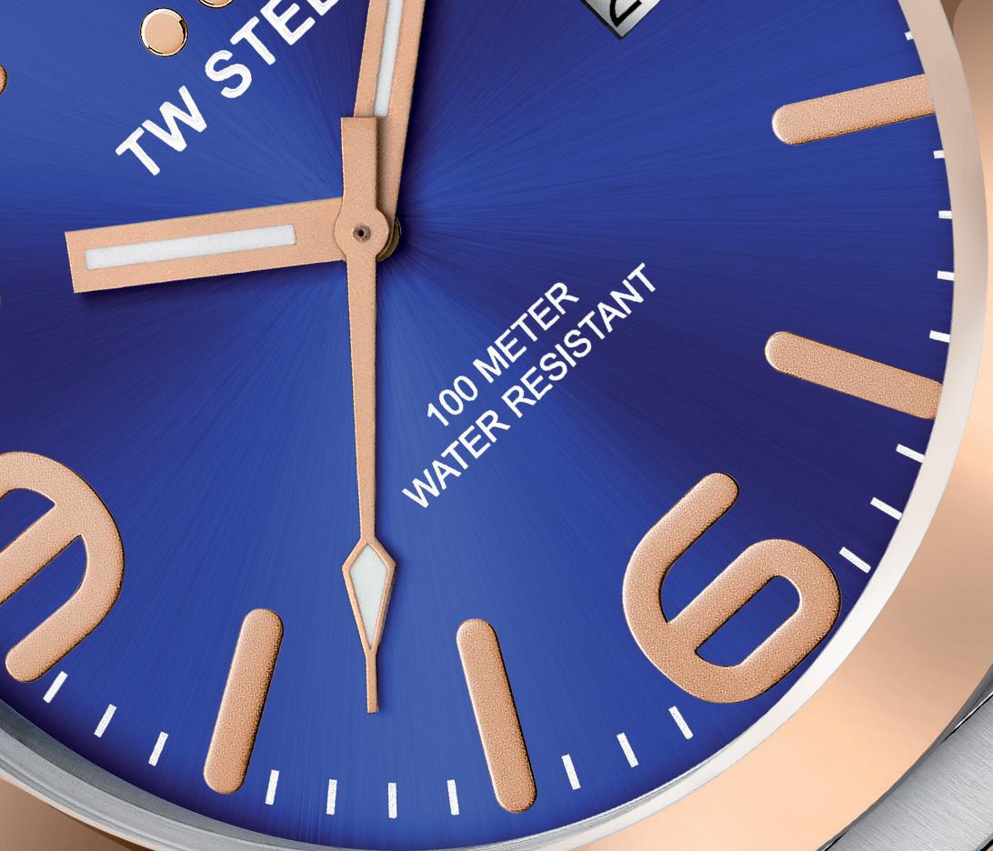 Our new Canteen Bracelet collection steps up in a clean, fresh style. This model features a 2-tone brushed steel case with PVD rose gold plating and a sunray blue dial.