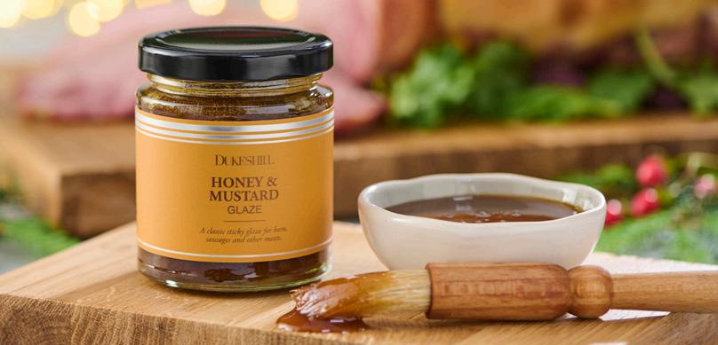 The hams on this page are shown glazed with our Honey & Mustard Ham Glaze (not included), and studded with cloves. JHCHGZ Honey & Mustard Glaze • 227g £5.25