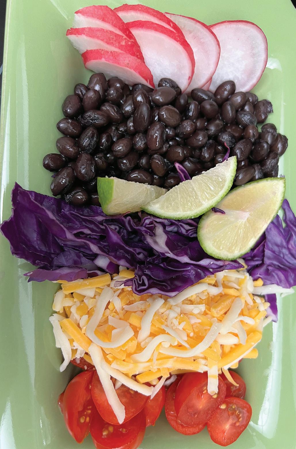 ▶ Warm spaghetti squash round topped with roasted red peppers and corn, black beans, sliced radish, mixed shredded cheese of your choice. Topped with lime wedges.