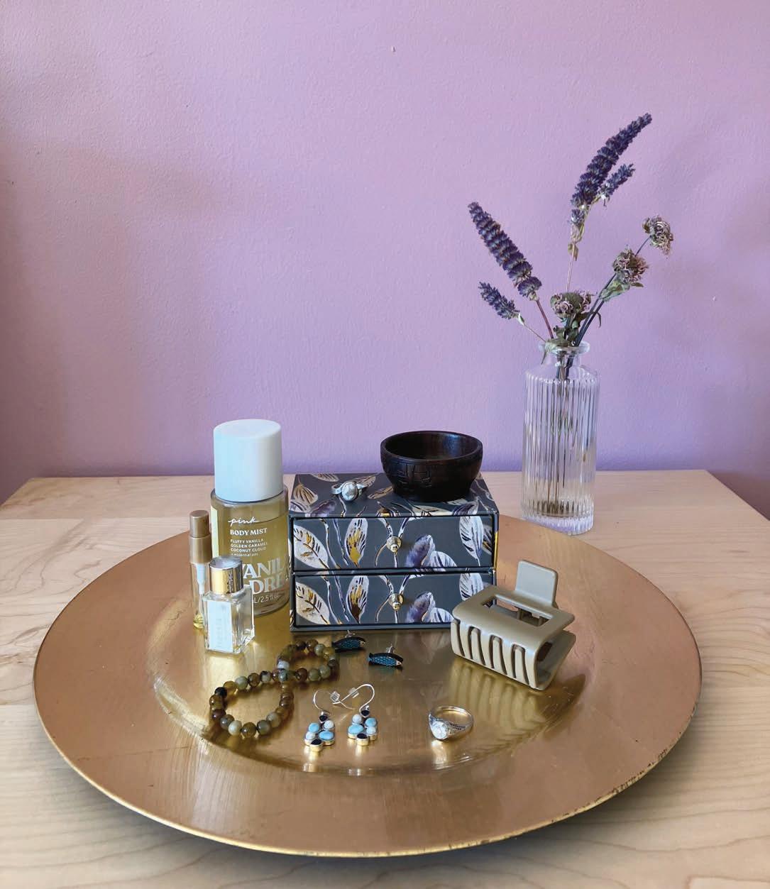 Materials: Gold charger plate, small decorative trays or dishes, jewelry, makeup, perfume or other items to display.
