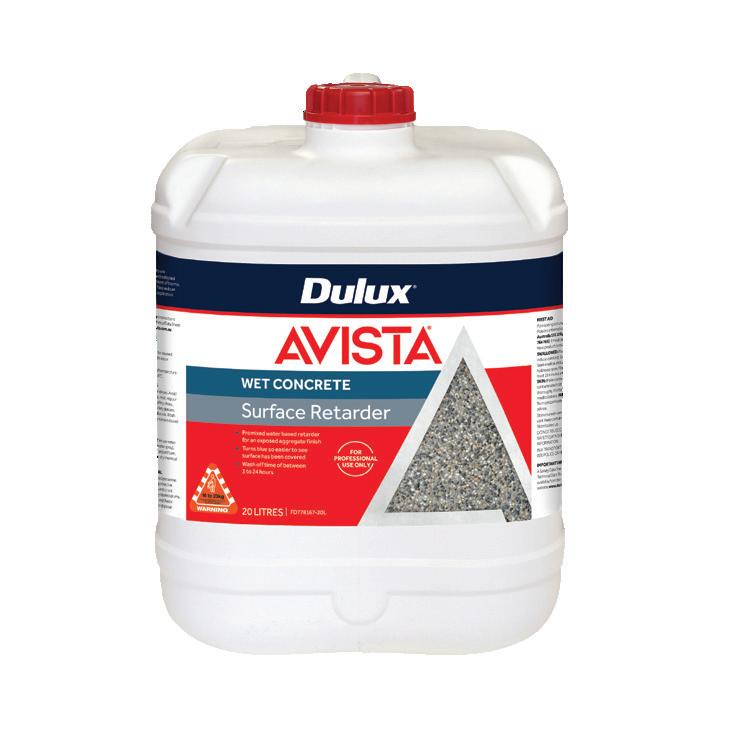 Dulux Avista Surface Retarder is used to reveal aggregate in freshly placed horizontal concrete by delaying the surface set so that the mortar paste may be washed from between the aggregate particles, after the mass of the concrete has set. This produces an attractive exposed aggregate finish, or a key for subsequent pours or renders e.g. floors, driveways and paving.