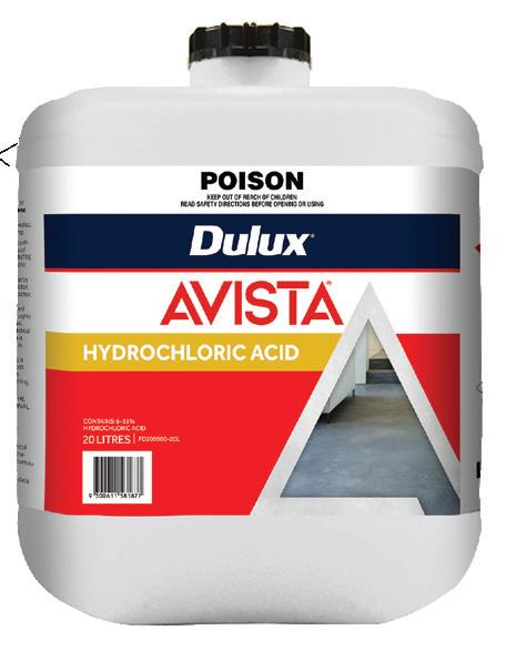 Dulux Avista Hydrochloric Acid is used for acid etching of concrete surfaces prior to the application of Dulux Avista decorative coatings and repair mortars. The hydrochloric acid must be diluted with water. The ratio will vary depending on the surface texture and condition. However, the general ratio is 1 part acid to 20 parts water.