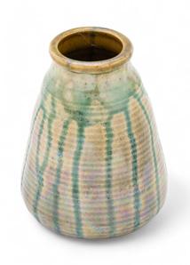 Pewabic Pottery (Detroit) Drip Glaze Ribbed Ceramic Vase, 1910-1967, H 5.5” Dia. 4.25”