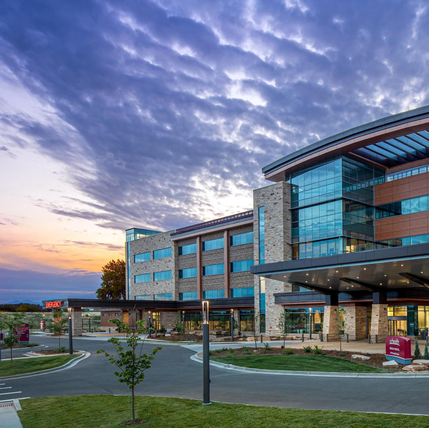 This four-story hospital and medical office building includes a birth center, emergency care, heart and vascular care, a laboratory, pharmacy, radiology unit, and surgical care. The facility allows UCHealth to provide care for up to 400 patients a day. The hospital provides 53 beds with room to grow and includes an intensive care unit, emergency department, operating rooms, advanced cardiology services, a birth center and a pharmacy. It features a heliport for emergency transfers to other acutecare hospitals. The three-story medical center includes 192 exam rooms and is home to many UCHealth physicians who provide primary and specialty care to patients across the region. Outpatient services include cancer care, dermatology, ear, nose and throat, general surgery, imaging, labs, neurology, obstetrics/gynecology, orthopedics, pediatrics, physical therapy, primary care, pulmonary, rehabilitation, rheumatology, urology and a pharmacy.