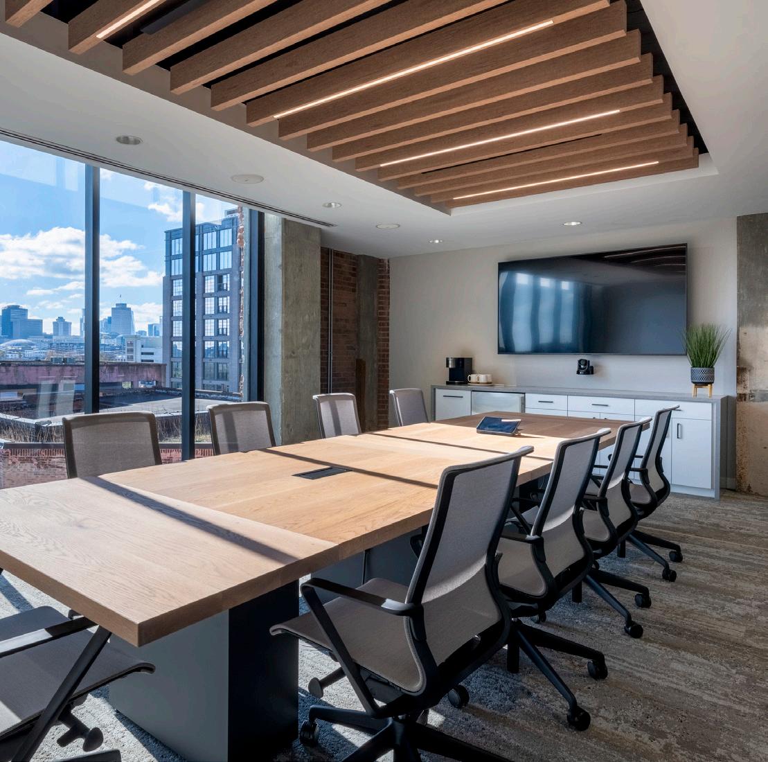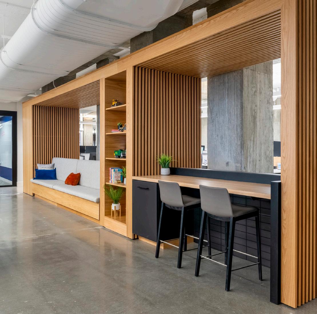 Located on the third floor in the 17th & Grand office building on Music Row, Cooper Steel’s new 15,000-square-foot Nashville office includes demountable wall partitions, decorative steel beams, large conference rooms with curved corner glass, a golf simulator, a folding storefront wall, and a cafe area with upholstery seats. The space also includes specialty ceilings such as acoustic felt blades, metal mesh ceilings with axiom trims, and a tongue and groove ceiling system.