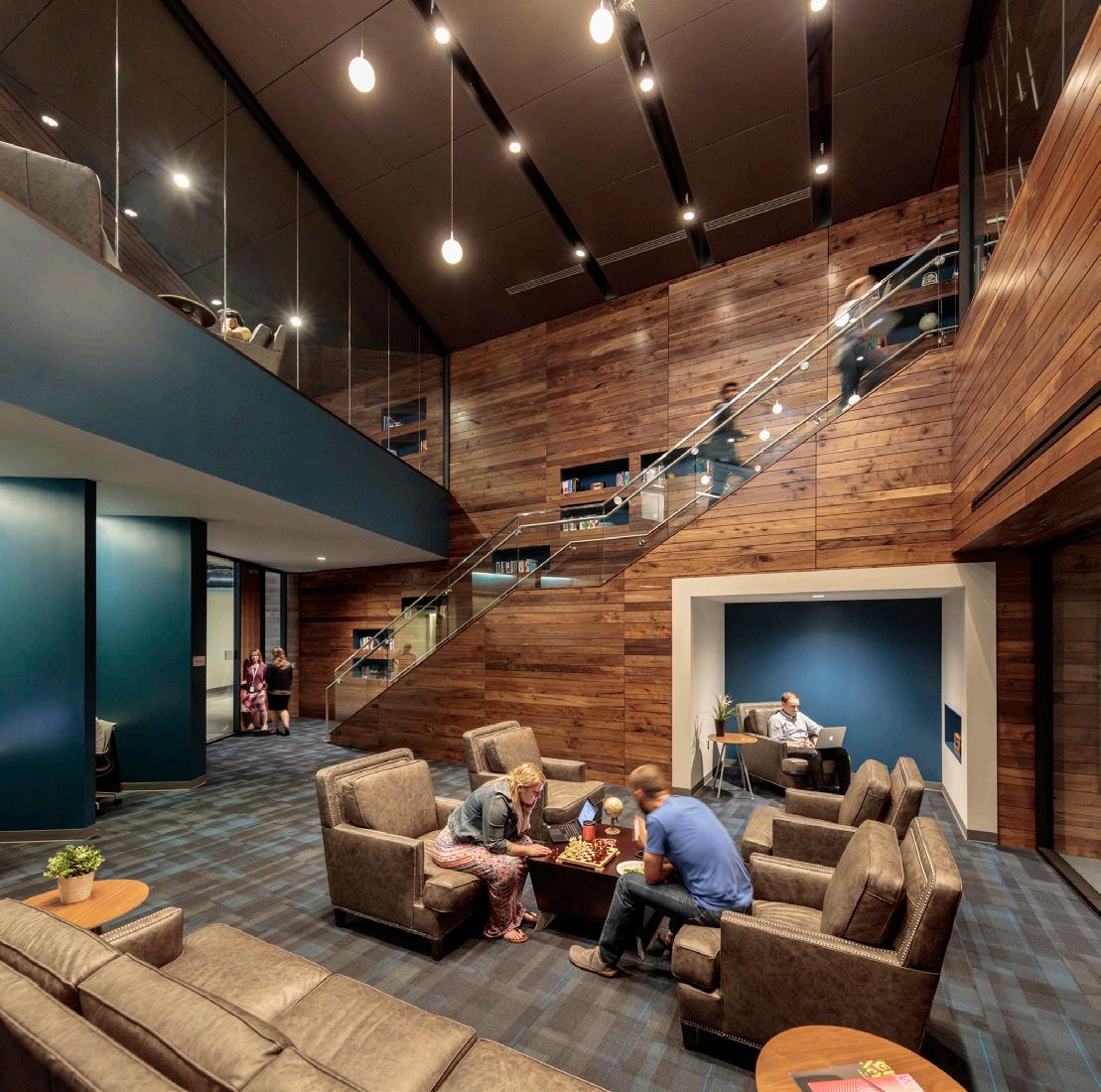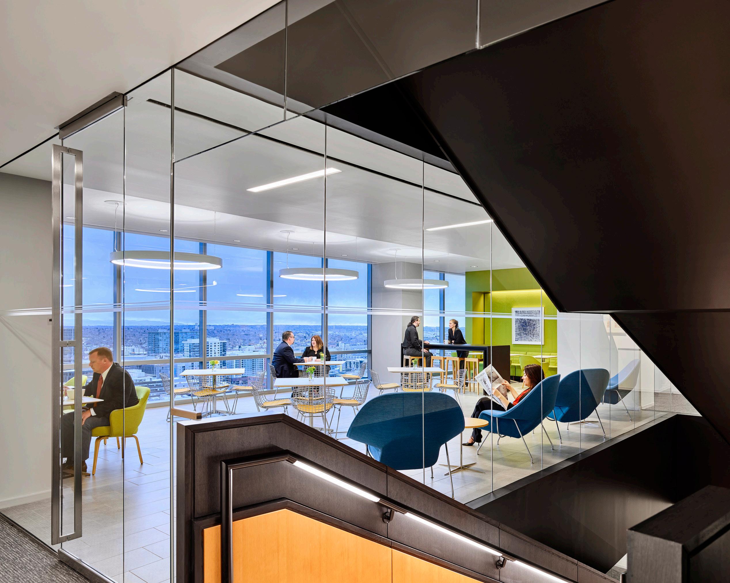 Generous corridors feature social spaces, work islands, coffee bars, and conversation niches to increase collaboration and spontaneous connections among attorneys. Designed as a series of window boxes, conference rooms are strategically named to correspond to the mountain peaks they frame. Allowing employees quick and easy access to important services, an on-site nurse’s office and wellness suite was incorporated into the design. Additionally, an employee cafe delivers a more casual meeting setting and access to a variety of light dining and beverage choices. The four floors are integrated through a dynamic sculptural stair and glass partitions that preserve visual connection.