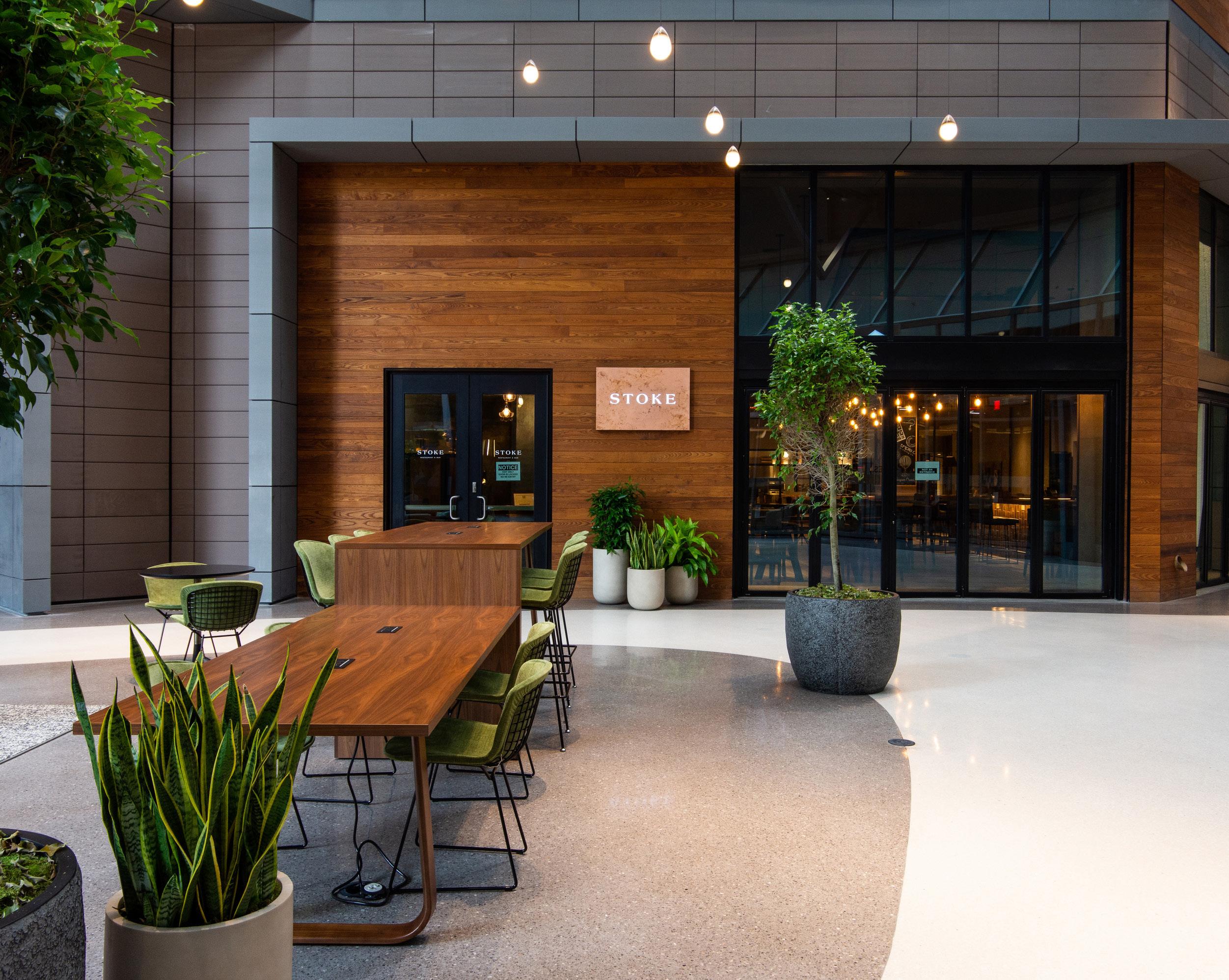 The building offers a flexible work environment that encourages innovation, a sense of community and the cross pollination of ideas among tenants. The interior is open with exposed ceilings and duct work and features a bike barn, fitness room, in-house cafe, shared balconies that overlook the South Platte River and a patio that fronts the bike path and Commons Park.