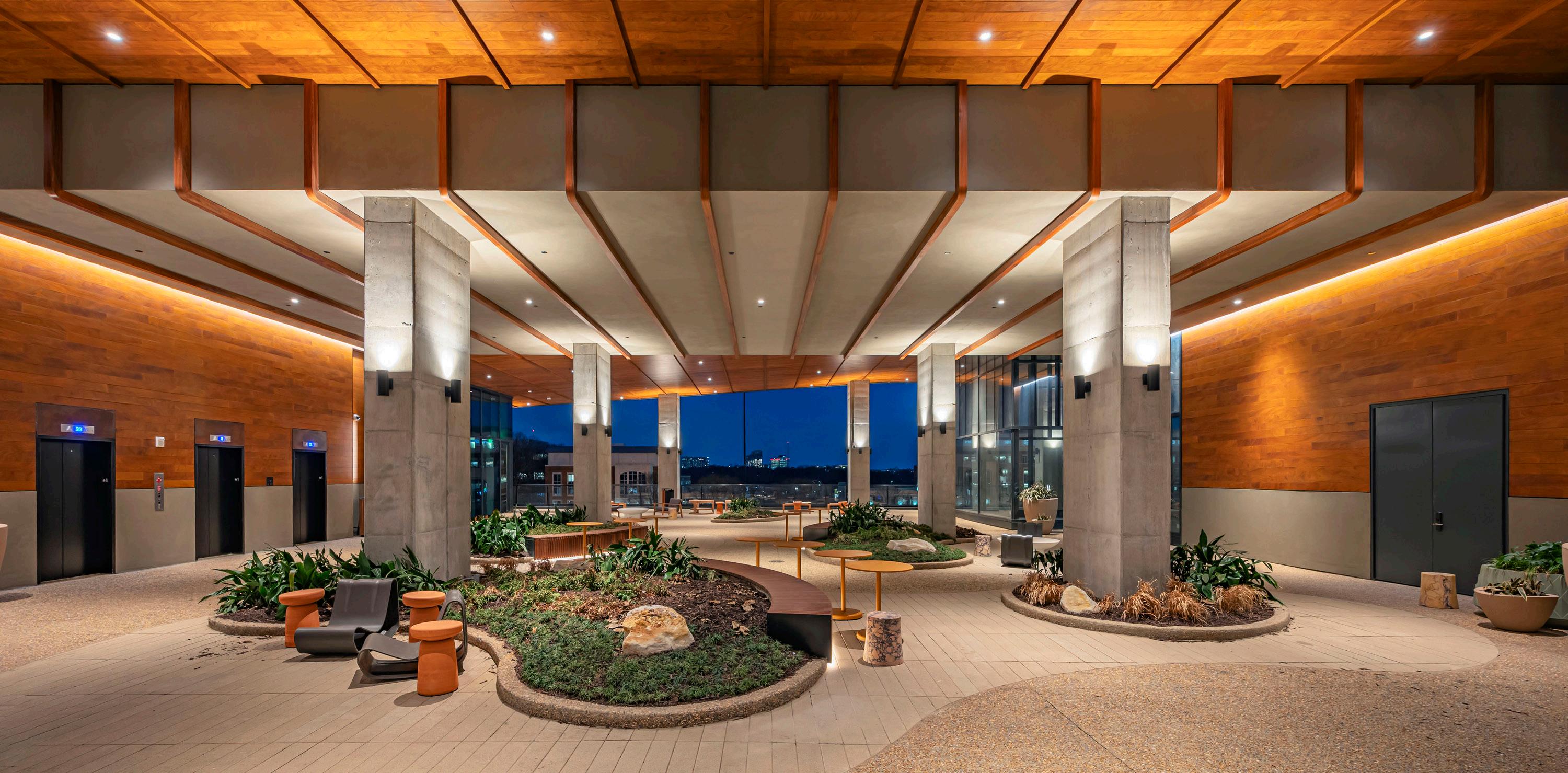 Gulch Crossing is a modern, 8-story, 225,000-square-foot building on top of a 5-story parking garage. The Demonbreun Street-level lobby features 3,000 square feet of retail space and serves as the primary entrance to the project’s 750-space structured parking garage totaling 543,000 square feet. The parking garage is situated under the office tower and extends from Demonbreun to a second entrance on 11th Avenue, below which includes two more levels of underground parking. The upper and lower levels of the project are connected by a monumental pedestrian staircase, providing access from Demonbreun Street to more than 16,000 square feet of ground floor retail space along 11th Avenue and more than 40 dining and shopping options in the Gulch. By emphasizing innovation and design, Gulch Crossing has set a new standard for Class A office space in Nashville as it pays homage to the site’s rail yard history with an elaborate 2-story box car lobby.