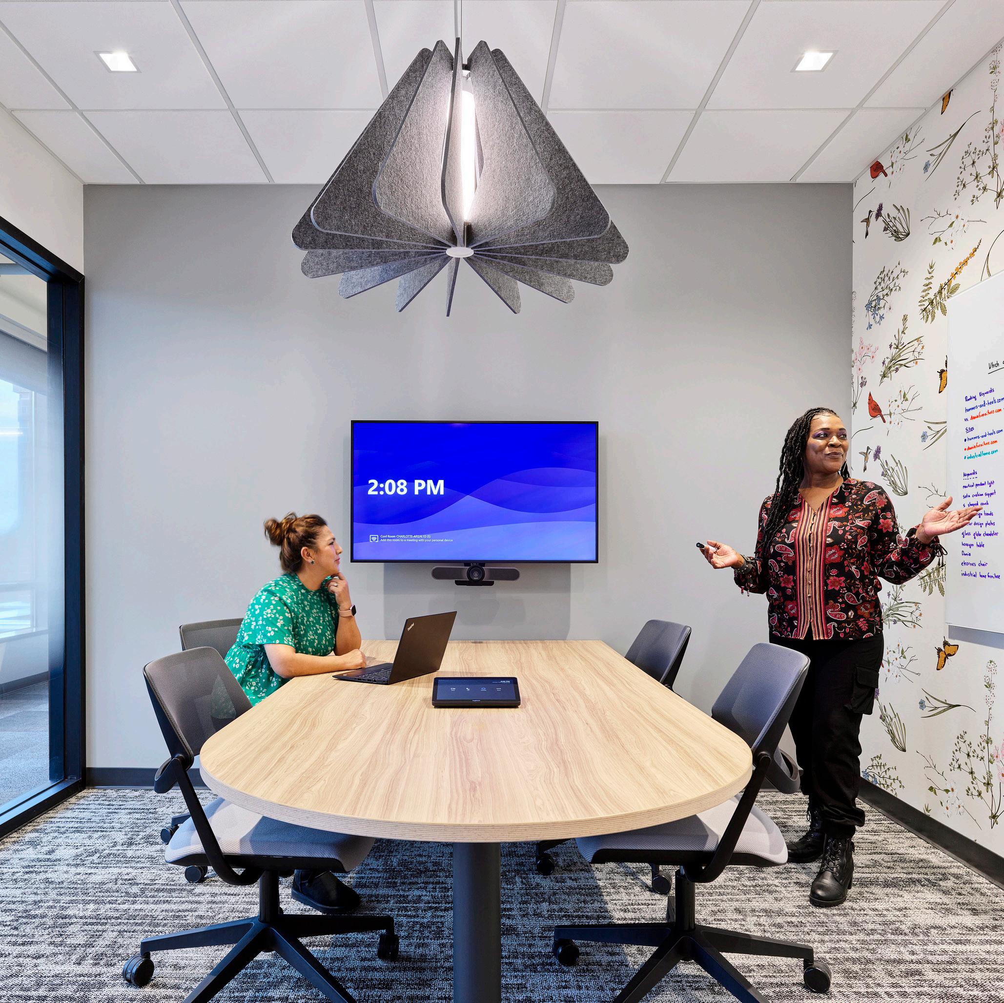 The AP2 renovations project is a strikingly bright space full of vibrant colors, textures, and patterns to inspire creativity. Employees are motivated to move about the space as they work and collaborate with colleagues. Stationary workspaces are not assigned, so employees are allowed and even encouraged to change their seats daily. Lockers are provided as storage space for personal belongings. There are dozens of open meeting spaces throughout the floor for employees to work together on a task or bounce ideas off one another. In addition, there are focus rooms where employees can retreat to concentrate if needed. The lively decor is punctuated by natural elements like living moss walls and other potted plants to inspire calm and tranquility. The space was designed and built to Microsoft’s accessibility standards prioritizing functionality and authenticity. These standards go above and beyond minimum design requirements and regulations.