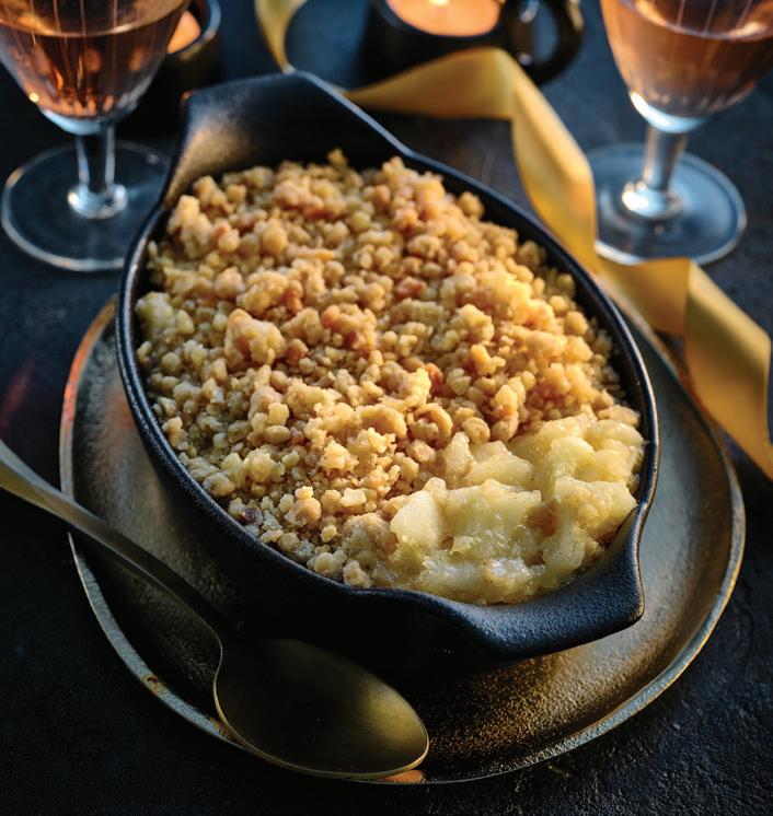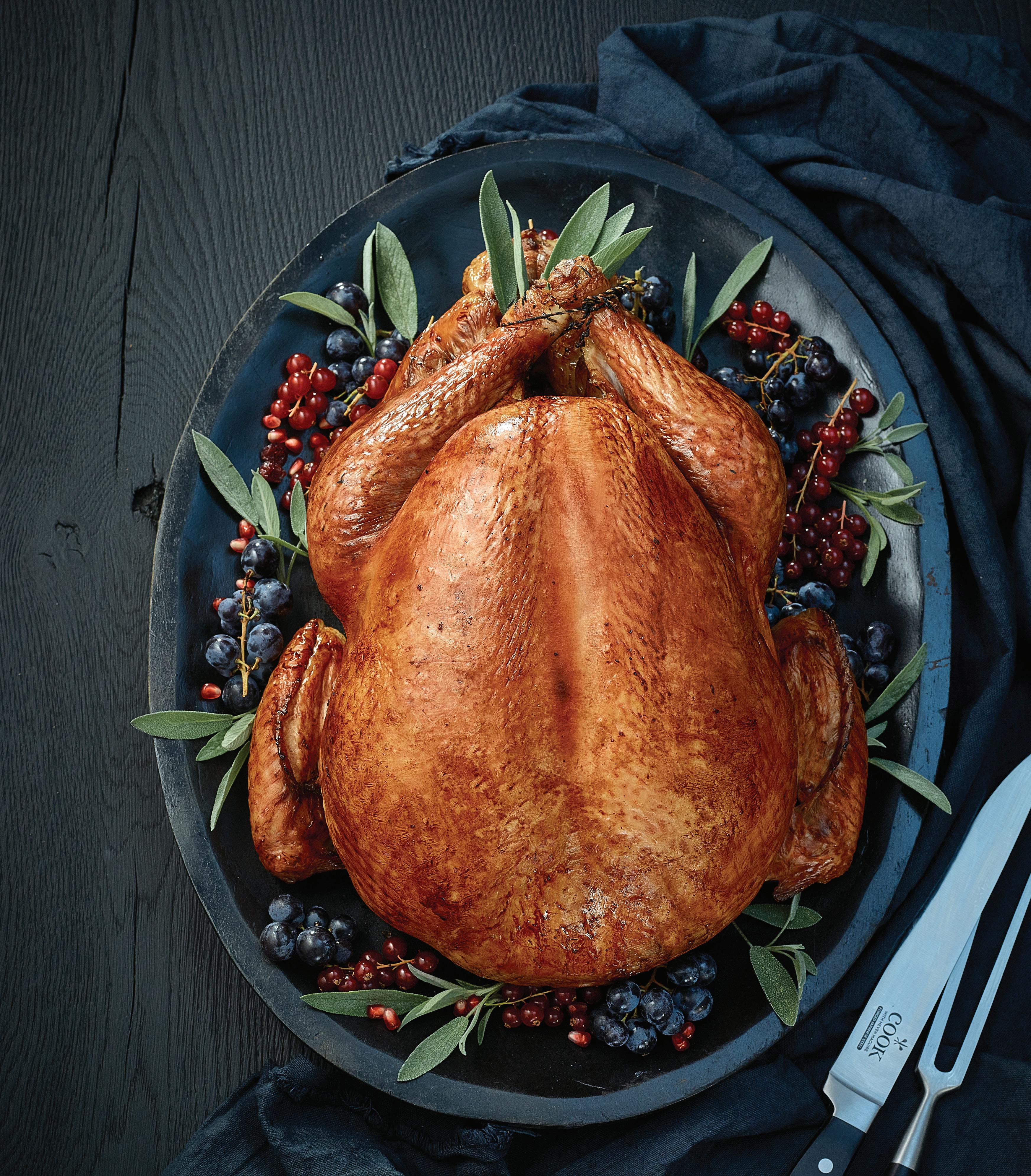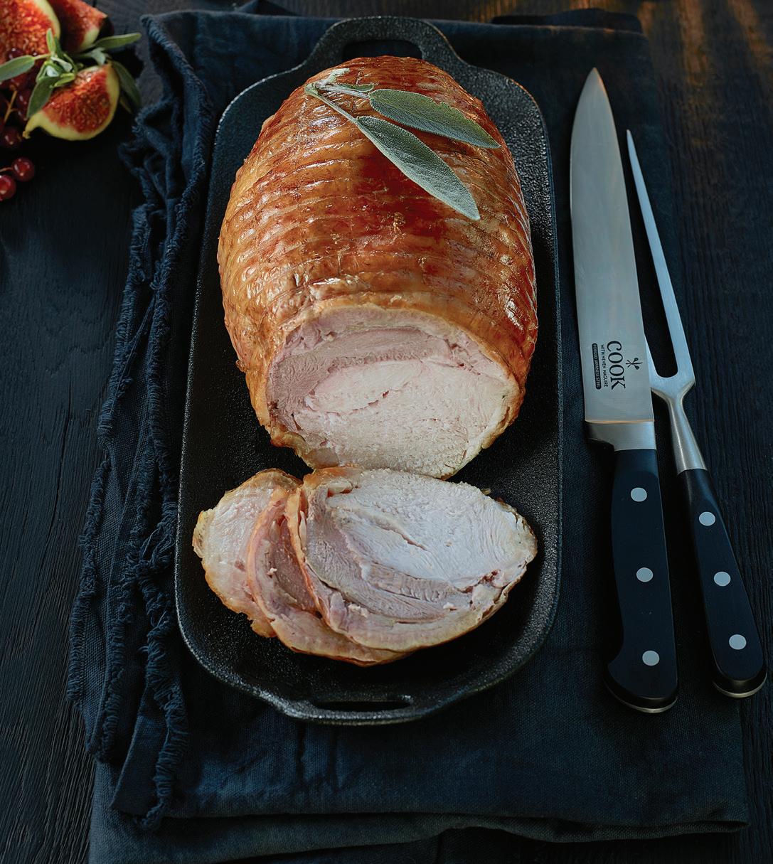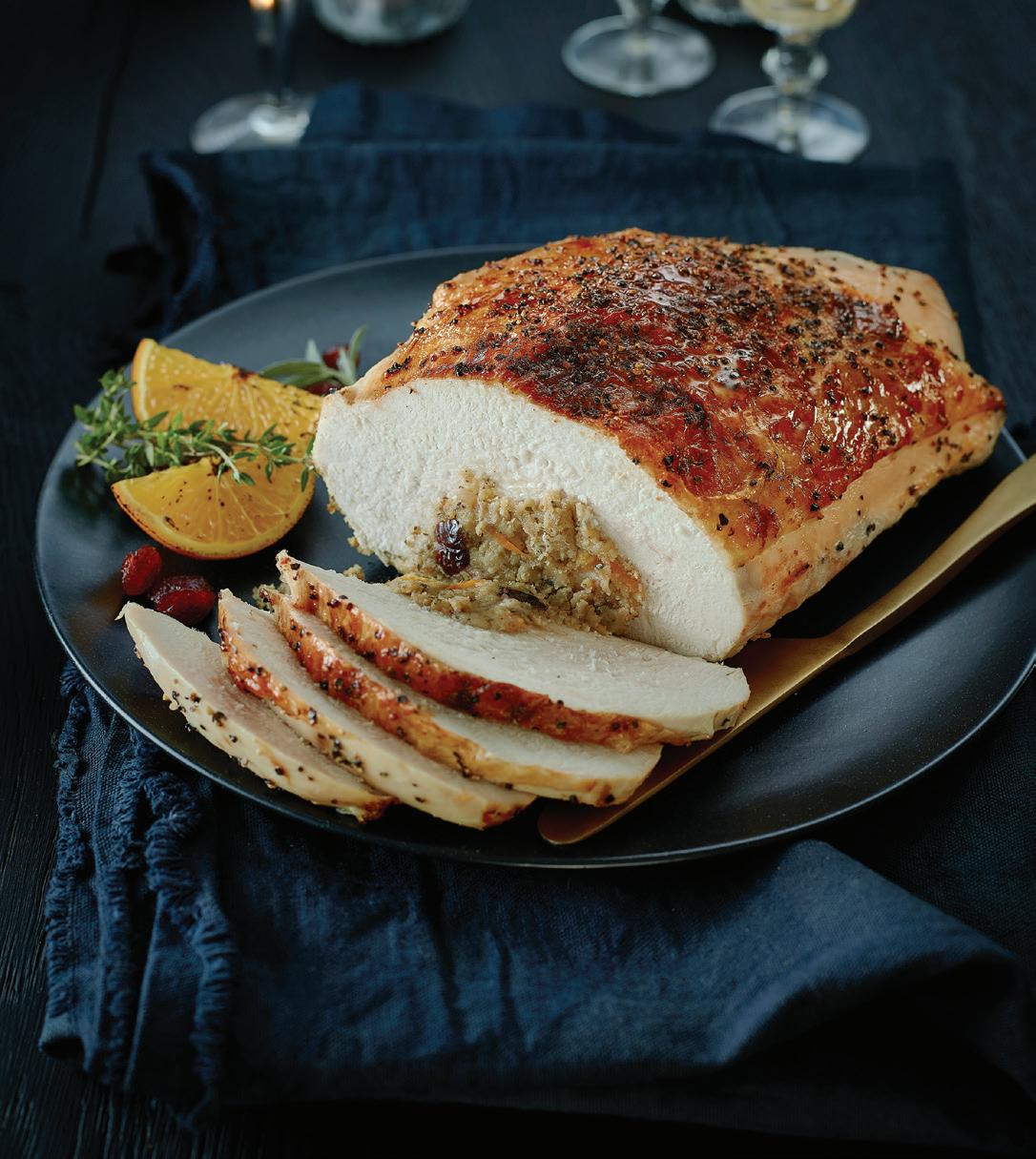 14 CHRISTMAS | 2022 Ingredients (Serves 6-8) - 1 Simply Better Heritage Bronze Fresh Irish Reared Turkey Crown - 1 Pack of Simply Better Dry Cured Whiskey Smoked Irish Streaky Rashers - 75g Butter, softened - 1 Garlic Clove, crushed - Finely Grated Rind of 1 Lemon - 1 Tbsp Chopped Fresh Flat Leaf Parsley - 2 Tsp Chopped Fresh Tarragon For the Buttermilk Brine: - 2 Litres Buttermilk - 2 Lemons, thinly sliced - 1 Garlic Bulb, separated into cloves and sliced - 15g Fresh Tarragon Sprigs, roughly bruised - 3 Tbsp Sea Salt - 2 Tsp Freshly Ground Black Pepper Method 1. Mix together all the ingredients for the buttermilk brine in a turkey bag, then add the turkey crown. Tie up the bag securely and put in the salad drawer at the bottom of the fridge – up to two days is best, but brine for at least 24 hours. 2. Preheat the oven to 190°C (375°F / Gas Mark 5). 3. Cream the butter until soft, then beat in the garlic, lemon rind and herbs. Remove the crown from the brine and drain off any excess liquid, then pat the skin dry with kitchen paper. Gently loosen the neck flap away from the breast and pack the flavoured butter right under the skin. Rub the butter into the flesh, then re-cover with the skin and secure with a small skewer. Cover the top of the turkey crown with the rashers. 4. Put the prepared turkey in the oven and cook according to the time shown on the pack label: approximately 20 minutes per 450g (1lb) plus 20 minutes. This will cook much quicker than a whole turkey, so make sure to baste it often. You can cover it with foil if it’s browning too quickly. When cooked, cover with foil to rest and keep warm. Drain away the cooking juices to make the gravy. 5. To serve, carve the turkey crown into slices and arrange on warmed plates with a selection of your favourite accompaniments. Buttermilk Brined Roast Crown of Turkey with Lemon & Tarragon REC IPE