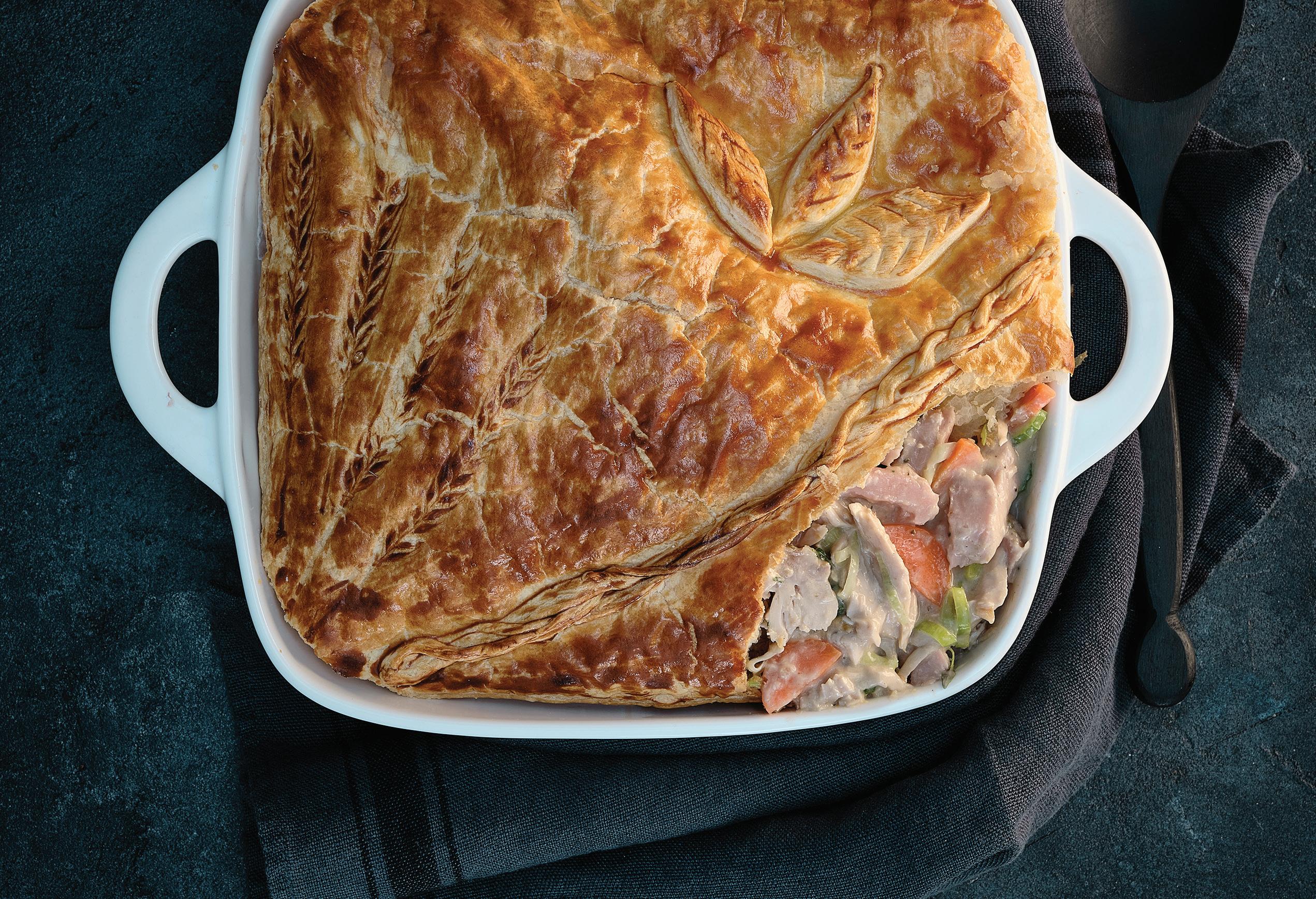 4. Roll the puff pastry on a lightly floured board until it’s the thickness of a €1 coin and large enough to easily cover the ovenproof dish. Brush the edge of the pie dish with the egg wash, then cover with the pastry. Use a sharp knife to trim down as necessary and use a fork to lightly press around the edges to crimp it. Stamp or cut out leaves from the pastry leftovers if liked. Brush with more egg wash and make a small hole in the middle to allow the steam to escape.