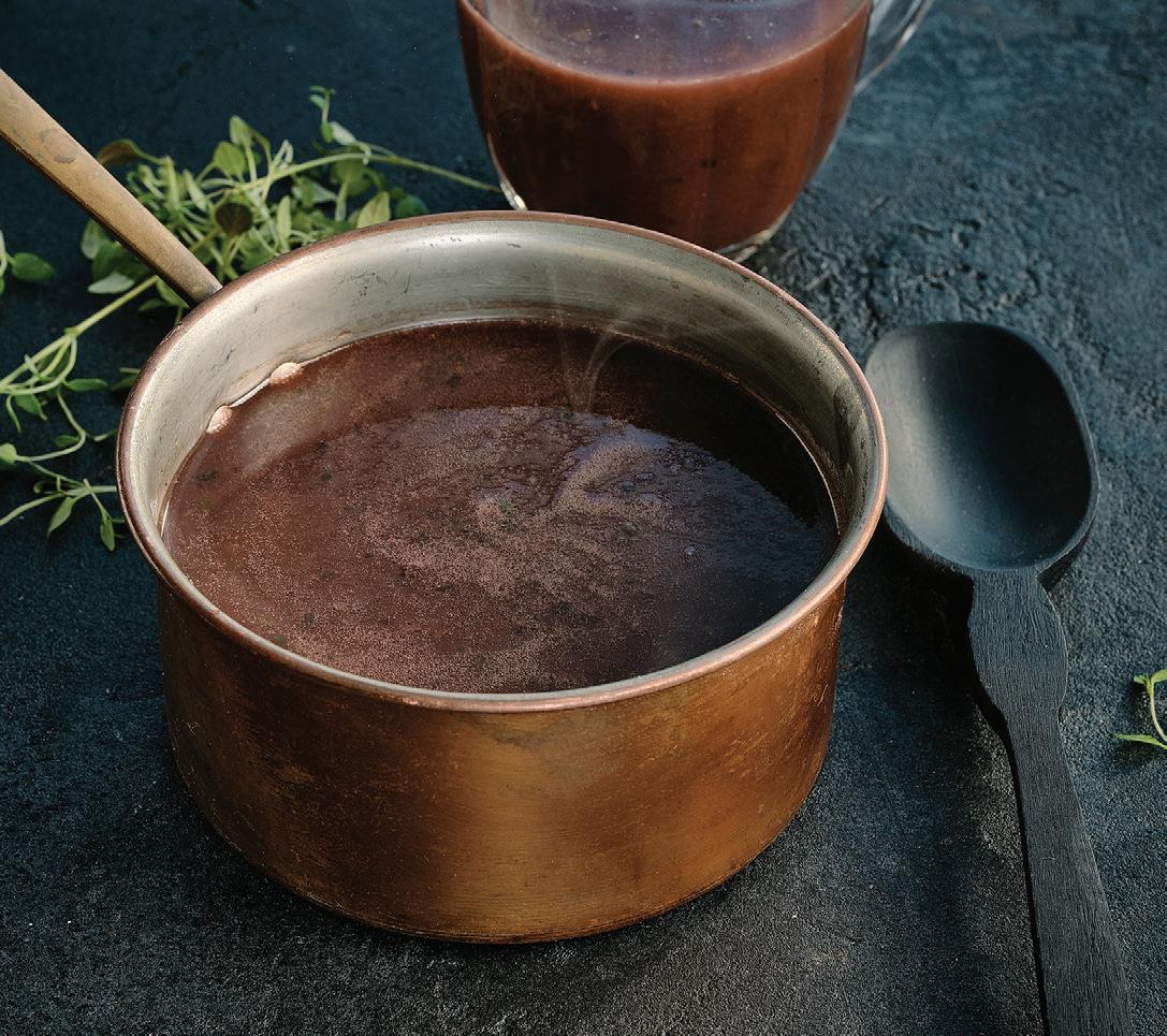 Whisk in the redcurrant jelly until dissolved, then add the skimmed juices from the roast turkey into the gravy and season to taste. Strain into a warmed gravy boat to serve.