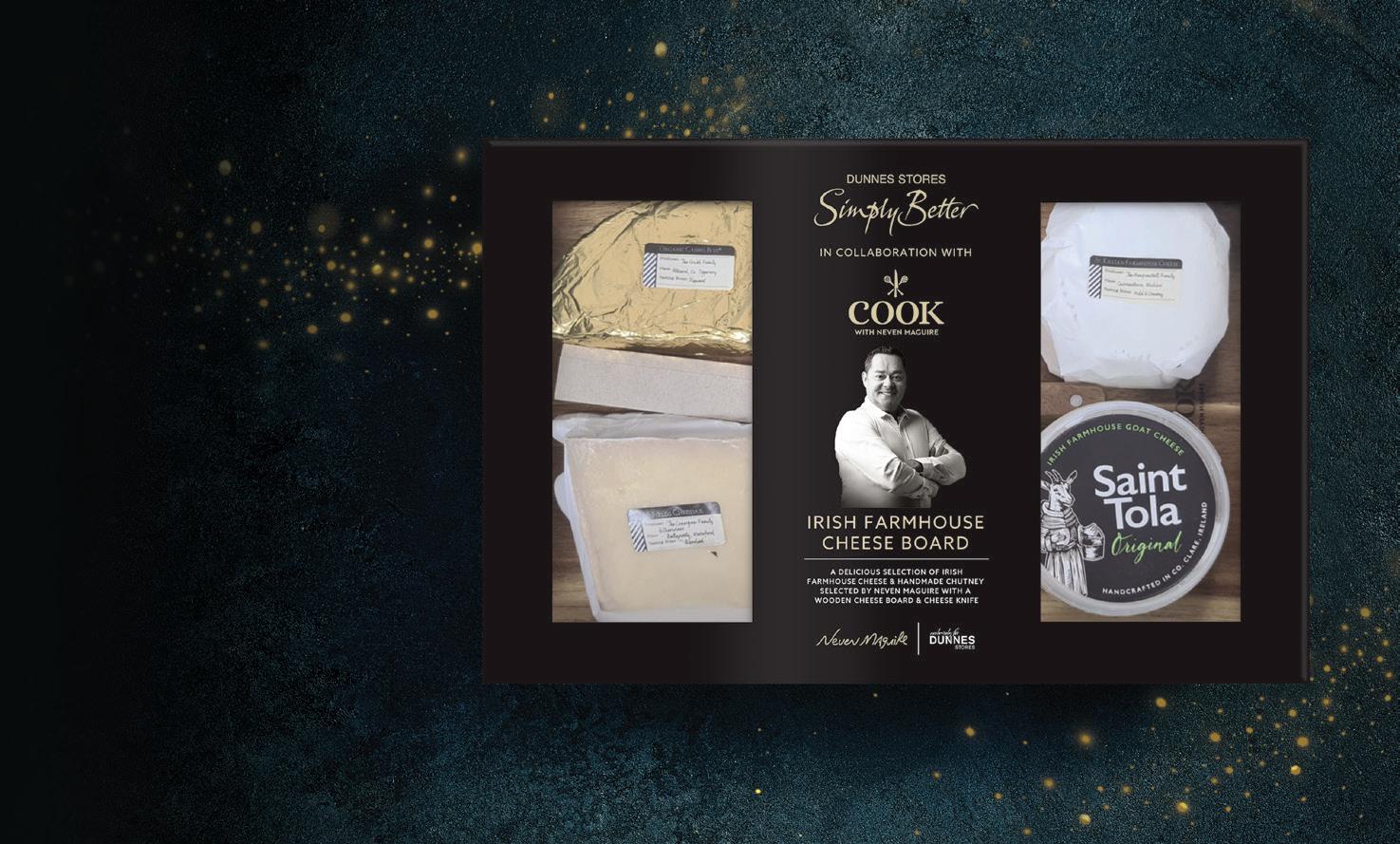 | WITH NEVEN MAGUIRE Simply Better GIFTING NEW Simply Better Farmhouse Irish Cheese Selection 795g | €19.99 (€25.14 Per Kg) Available In Store 09.12.22. NEW Simply Better Neven Maguire Irish Farmhouse Cheese Board A selection of Irish cheeses, handmade chutney, wooden cheese board and cheese knife. 615g | €29.99 (€48.76 Per Kg) Available In Store 09.12.22. Simply Better Celebration Hamper €100 Available In Store 01.12.22. Give the gift of taste this Christmas with our delicious range of food hampers. Hampers available from €50 - €100