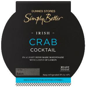 Seafood STARTERS From Shellfish Ireland, in Co. Cork. We travelled to the picturesque fishing town of Castletownbere, West Cork to meet the Murphy family to source our Simply Better Irish Dublin Bay Prawn Cocktail. Shellfish Ireland source our prawns from Irish fishing boats enabling them to process the catch at its freshest in Castletownbere. The prawns are combined with our delicious and light Irish made seafood sauce with a dash of French brandy and hints of spice for a classic starter. Our Simply Better Irish crab is caught in the Atlantic Ocean, one of the naturally richest and purest fishing grounds in Europe with Shellfish Ireland receiving daily supplies from their own trusted fishing fleet for the freshest catch. Ryan Murphy Shellfish Ireland, Co. Cork Simply Better Irish Dublin Bay Prawn Cocktail 150g | €6.49 (€43.27 Per Kg) Simply Better Irish Crab Cocktail 145g | €6.49 (€44.76 Per Kg) 7