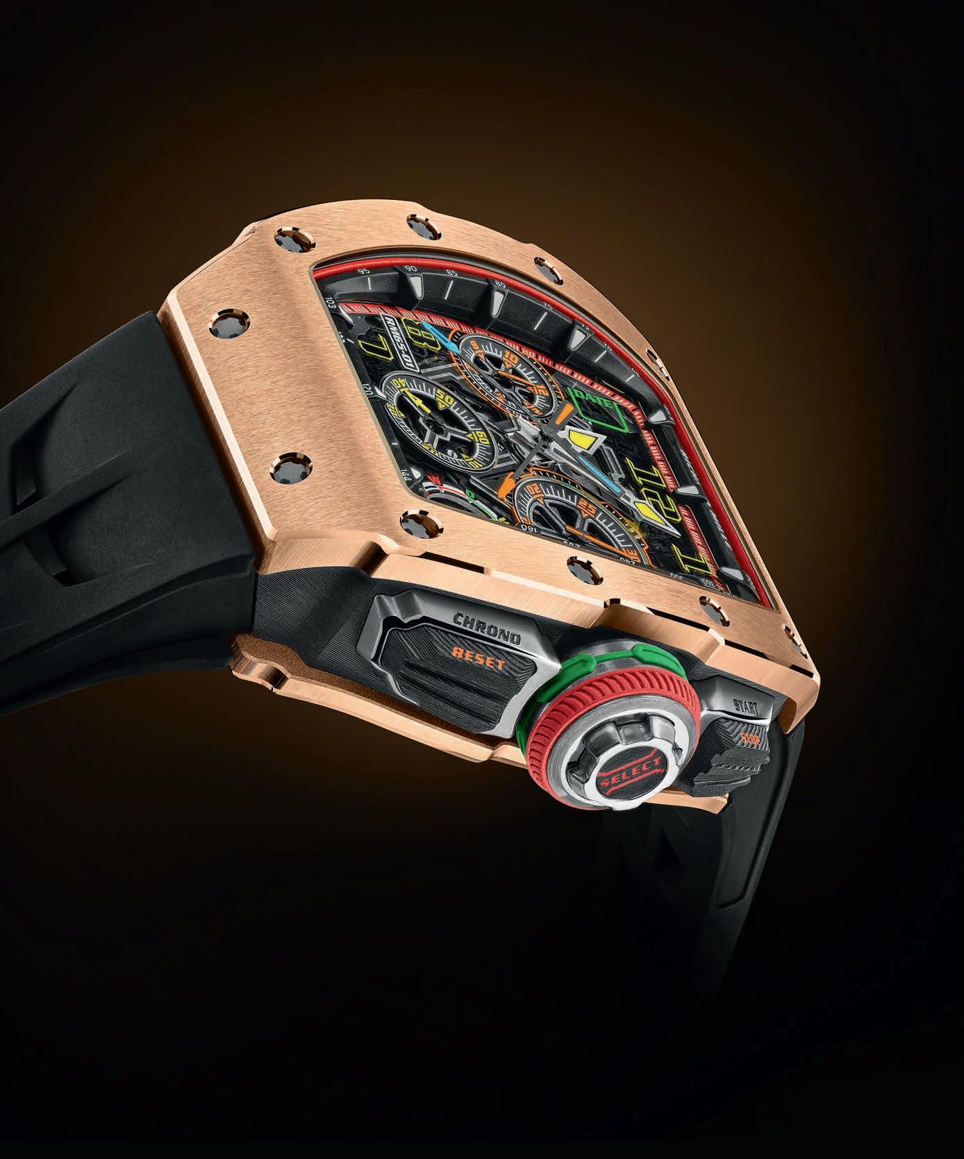 RM 65-01 Skeletonised automatic winding calibre 60-hour power reserve (±10%) Baseplate and bridges in grade 5 titanium Split-seconds chronograph Function selector and rapid winding mechanism Variable-geometry rotor Case in 5N red gold and Carbon TPT® A Racing Machine On The Wrist