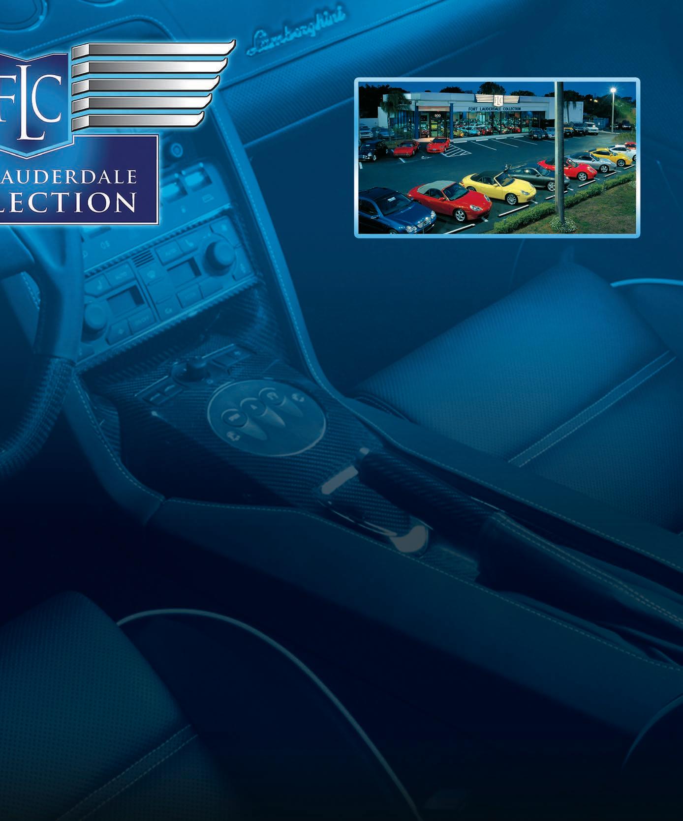 www.FortLauderdaleCollection.com Fort Lauderdale Collection South Fort Lauderdale Collection South (877) 700-9212 1301 E Sunrise Blvd. Fort Lauderdale, FL 33304 (877) 700-9212 1301 E Sunrise Blvd. Fort Lauderdale, FL 33304 2001 PORSCHE 911 TURBO Lapis Blue Metallic with Graphite Grey full leather interior. Only 6,336 miles from new. 3.6 liter flat-six engine paired to a 6-speed manual transmission. 2014BENTLEYCONTINENTALGTCSPEEDLEMANSORYII Onyx Metallic exterior with Hotspur leather interior. 26,373 miles. Features the Le Mansory II package with newly designed front apron, carbon fiber bonnet, 22” wheels and exhaust. 2022 FERRARI SF90 SPIDER Argento Nurburgring Metallic exterior with Rosso interior. Only 48 miles from new. Tailor Made, inspired by a 1957 Ferrari 625 LM. VIN#278208 2012 PORSCHE 911 TURBO S Carrera white exterior with saddle interior. Only 9,942 miles from new. Making close to 700hp with GMG’s WC Level 2 upgrade package. Loaded with options and aftermarket parts. 2006 FERRARI 430 COUPE 6-SPEED MANUAL 6-Speed Manual. Nero exterior over Nero Leather interior. 12,287 miles from new. A pure driver’s car powered by a 483hp V8 with no extra weight tacked on with unneeded options.