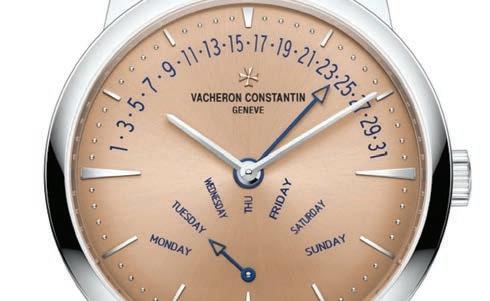 Vacheron Constantin’s Patrimony Retrograde Day Date indicates the date and day through a unique method.