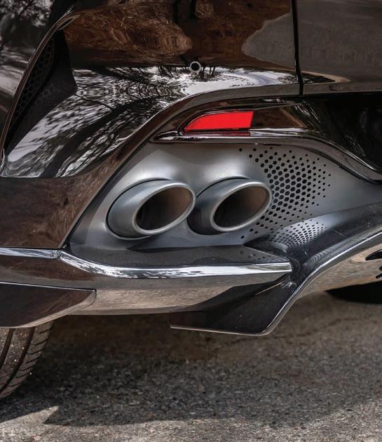 To handle the 707’s increased power and torque, Aston Martin replaced the nine-speed automatic’s torque converter with a wet clutch. It sends power to a rear-biased all-wheel-drive system. In most scenarios, this DBX is rear-wheel drive, with power only going to the front axle when the system detects slip. The 707 utilizes a new electronic limited-slip rear di erential with a shorter final drive ratio than the standard DBX. The result is a 3.1-second sprint to 60 mph and a top speed of 193 mph.