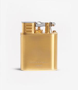 This Turbo lighter features Dunhill’s signature windscreen and striking mechanism. The core is engineered in 18k gold-plated brass, while the decorative surface is made by plating in 18k yellow gold, then in ruthenium. The ruthenium plate is subsequently stripped away and another 18k yellow gold plating applied.