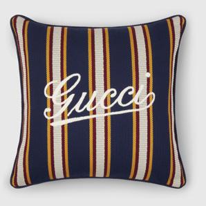 Part of Gucci’s Spring Summer 2025 décor collection, this cotton jacquard cushion showcases a bold stripe pattern in bordeaux, yellow, and white. The design is elevated by embroidered Gucci script, highlighting the house’s playful yet refined aesthetic. The piece adds a vibrant accent to any living space with its distinctive color and texture.