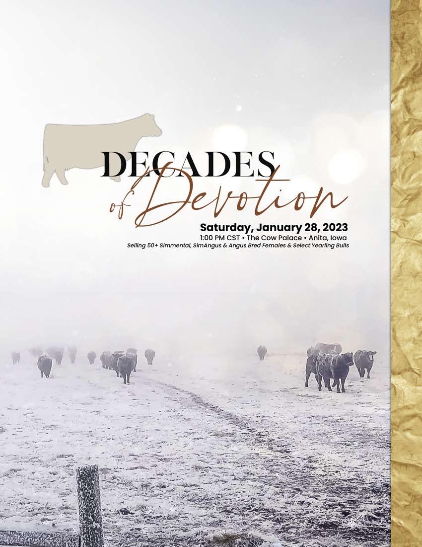 The Decades of Devotion Sale will be held Saturday January 28, 2023 at 1:00 pm CST at the Cow Palace in Anita, IA. Offering 52 Lots of Registered Simmental & Angus Bulls, Bred Heifers, & Genetic Lots. Online bidding at www.liveauctions.tv. Catalog designed by Generation 6 Marketing.
