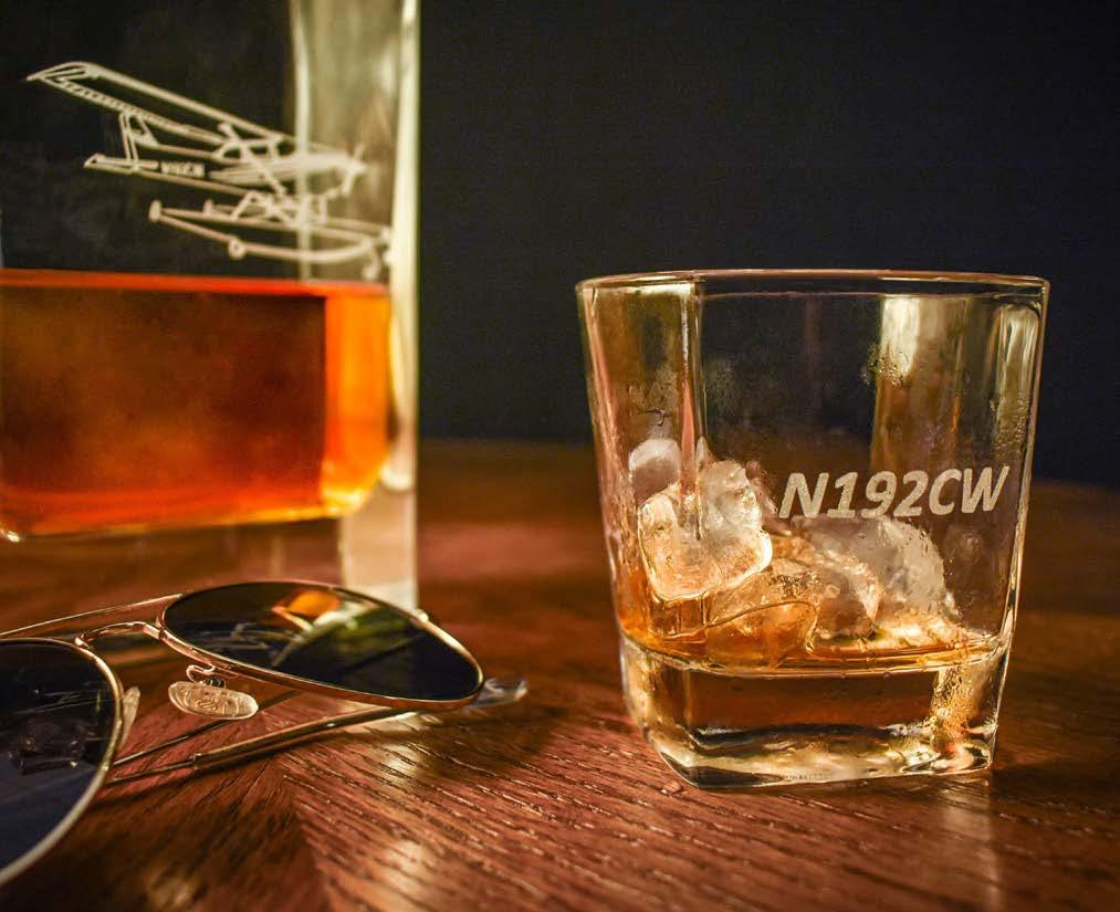 Etched with your aircraft’s tail number and the sleek silhouette of your aircraft, each glass and decanter tells a story only a pilot knows — a story of altitude, attitude, and arrival.