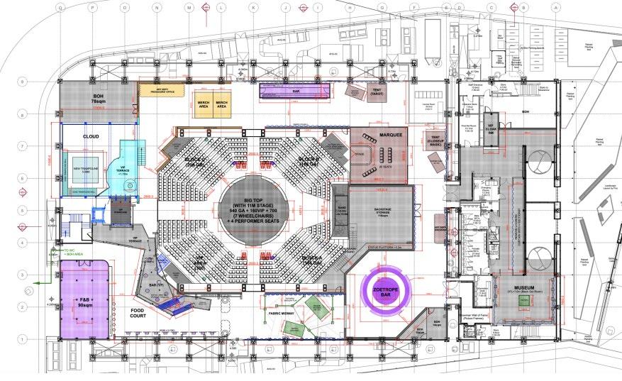 • “The building is comprised of two main parts, the Main Hall and the Front of House space. The Main Hall is a 40m by 60m ‘black box’ that the show will be created within. These are all interconnected, creating an audio/visual theatrical experience. You navigate through the theatrical set comprised of different areas within the space culminating in the seated ‘circus-style’ experience which ends the guest’s visit.”