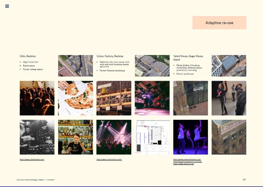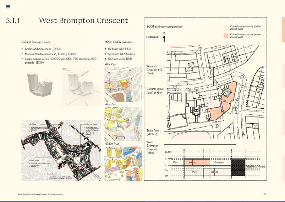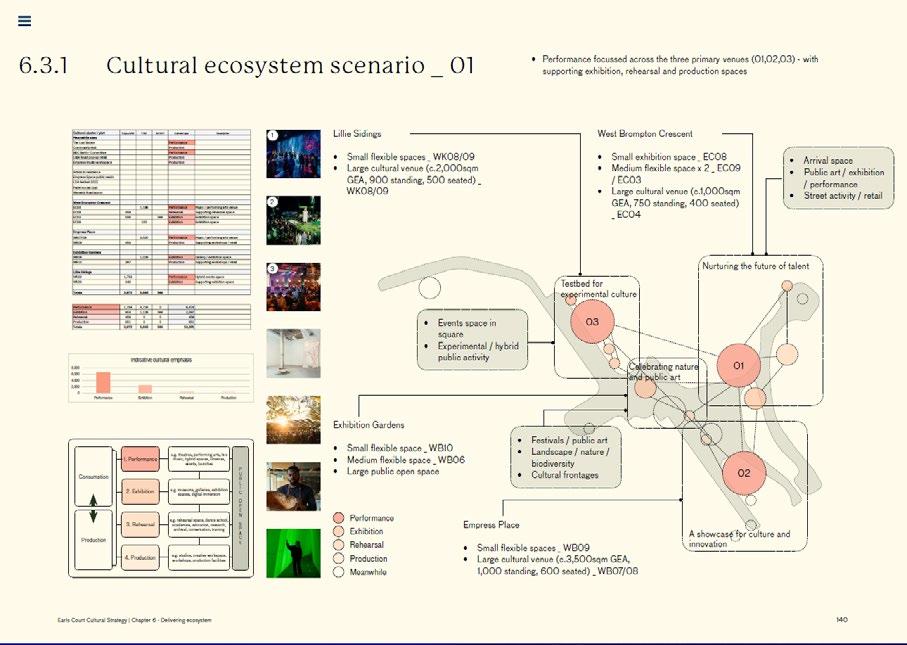 There is a strong policy basis for the delivery of culture as part of a mixed use scheme at a strategic scale - RBKC’s adopted Earl’s Court Placemaking Framework SPD set out an ambition to put Earls Court back on London’s cultural map and create a vibrant destination for culture and LBHF’s Cultural Strategy promotes the borough as a cultural destination and specifically identifies Earls Court as being critical to the development of the borough as a destination as one of the 4 themes of the LBHF Cultural Strategy (https:// www.wherecultureconnects.org.uk/theme-1destination-hammersmith-fulham).