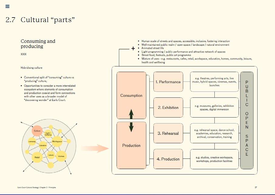 • At Earls Court the ambition is to develop a mix of uses and activities that shape a collective identity of a part of city - consuming and producing “culture” as an ecosystem that is responsive to its context. Enabling a variety of lived experiences - creating, producing and experiencing “wonder”.