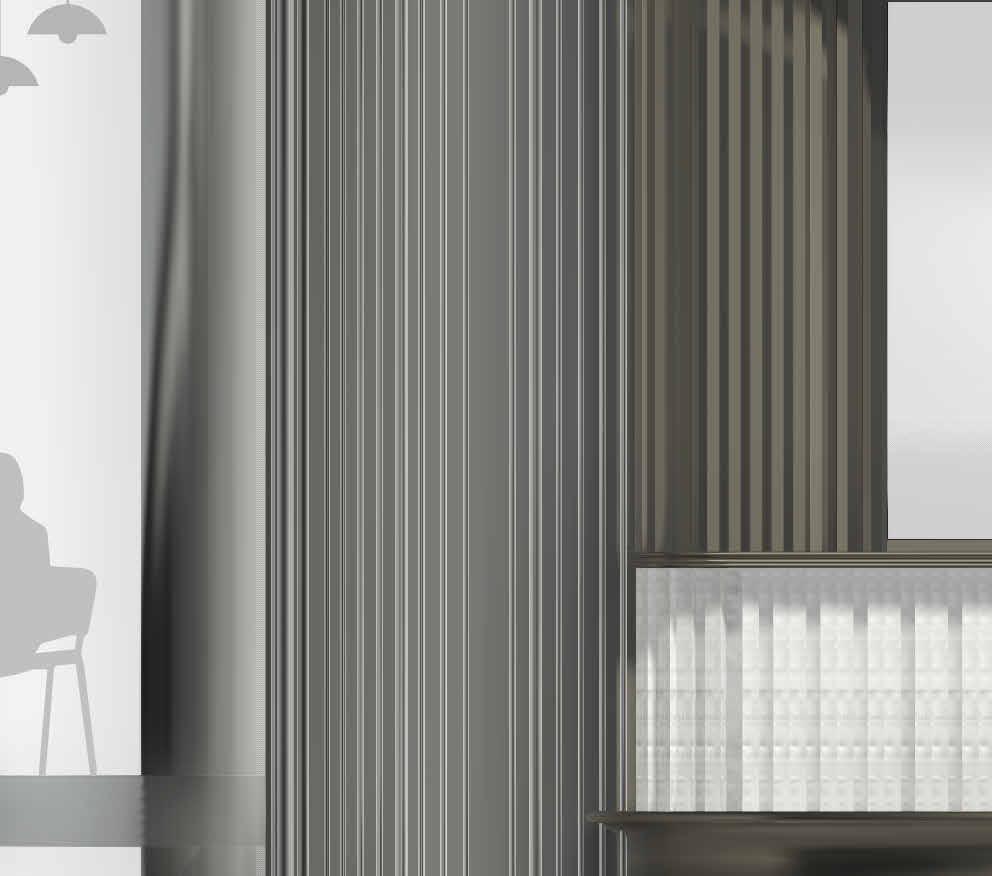The typical bay is predominantly a light beige colour. The concrete elements comprise a vertically prominent pilaster with a central concave scoop, a sunshade and a ribbed spandrel panel. Either side of the fixed window are perforated aluminium panels in dark bronze colour. Behind one of the aluminium panels is an operable panel for purge ventilation.