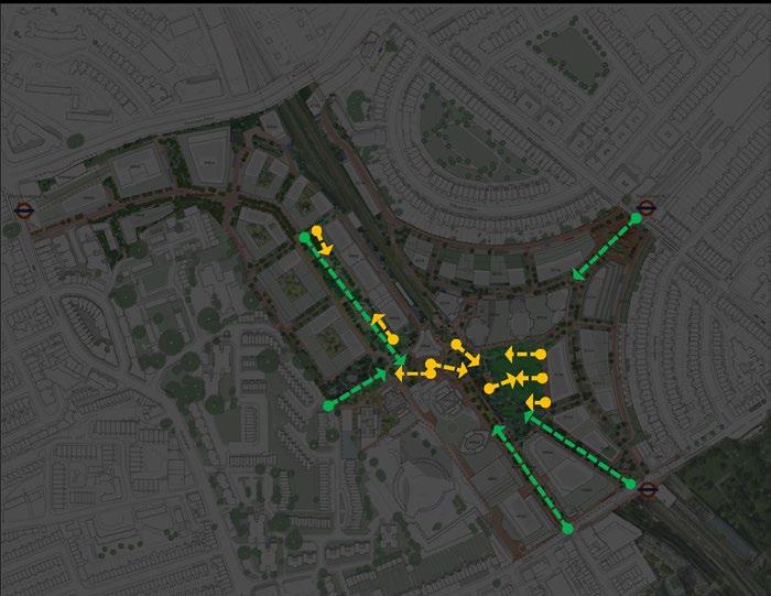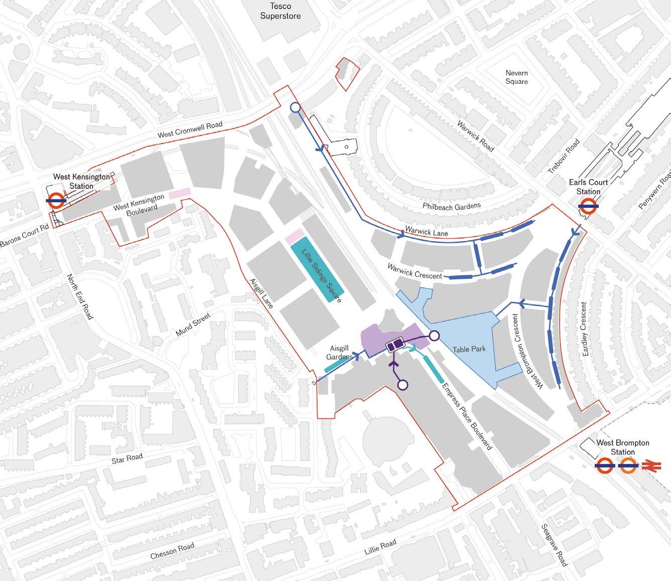 5. The lighter parts of this square should direct pedestrians along the primary routes of West Brompton Crescent or along the main Lillie Road thoroughfare towards the other primary Site entrance of Empress Place Boulevard. Trees and pathways forming the southern end of the Bioline should remain less bright, preserving the environment of the important biodiversity corridor.