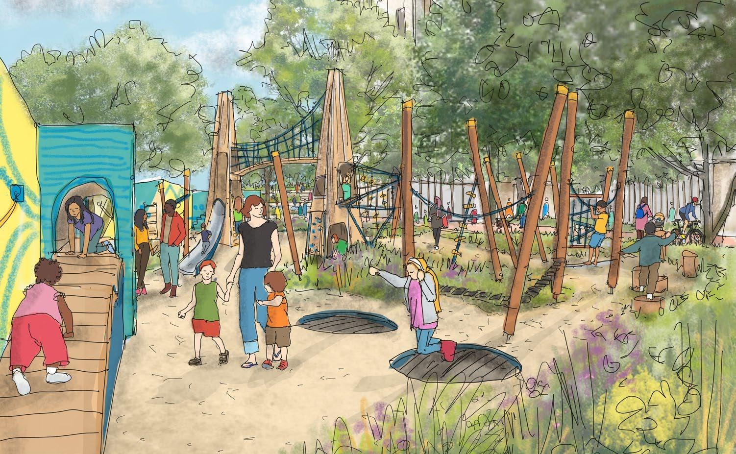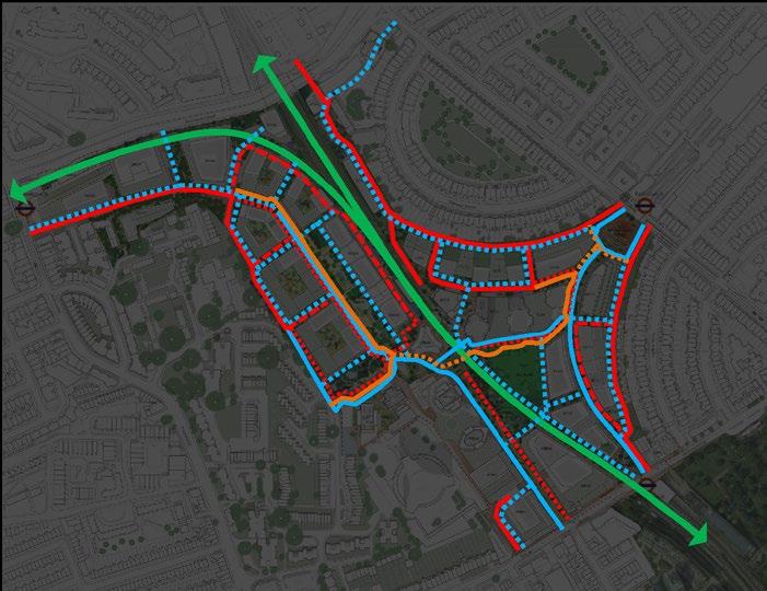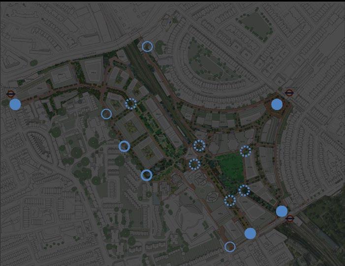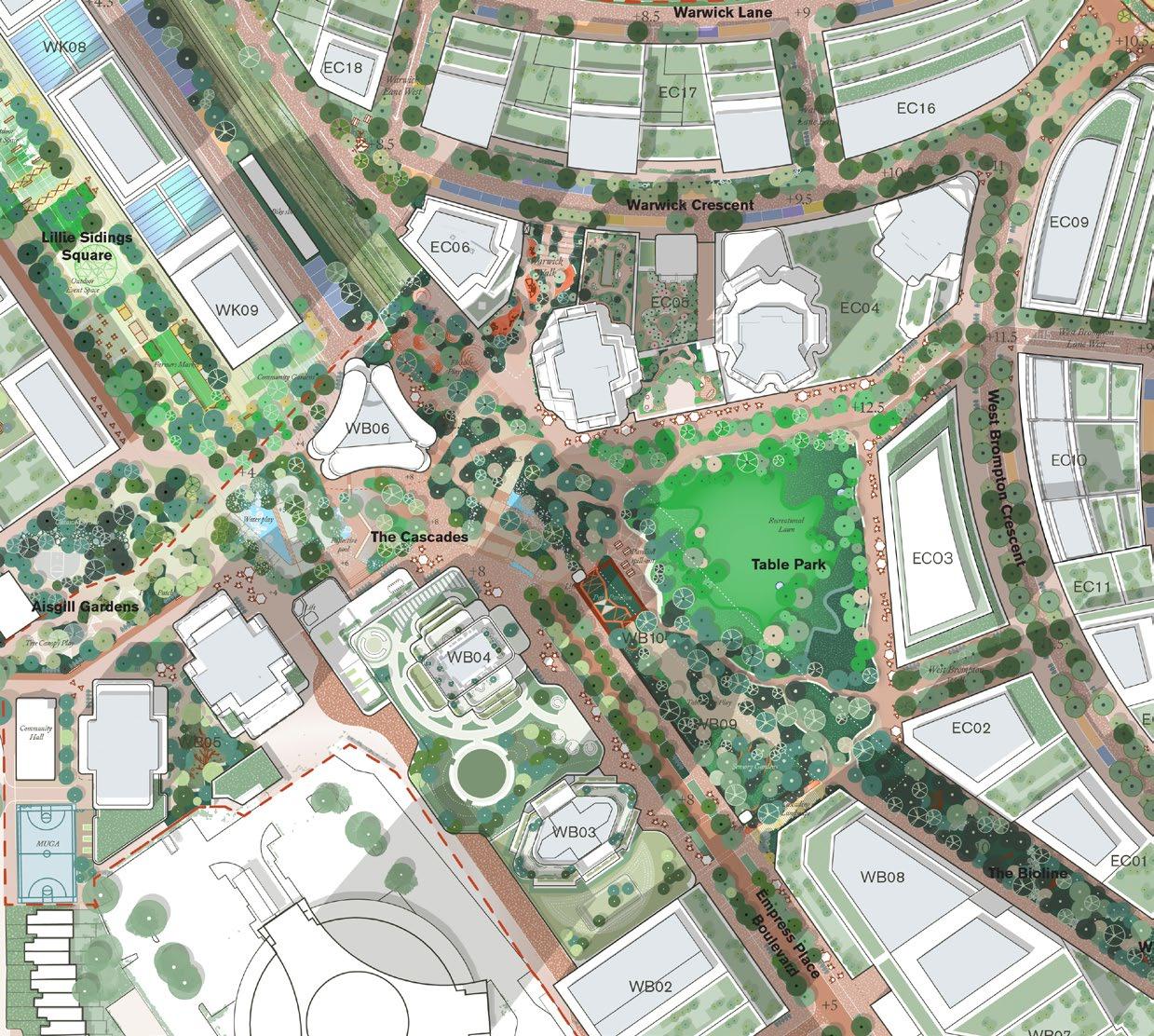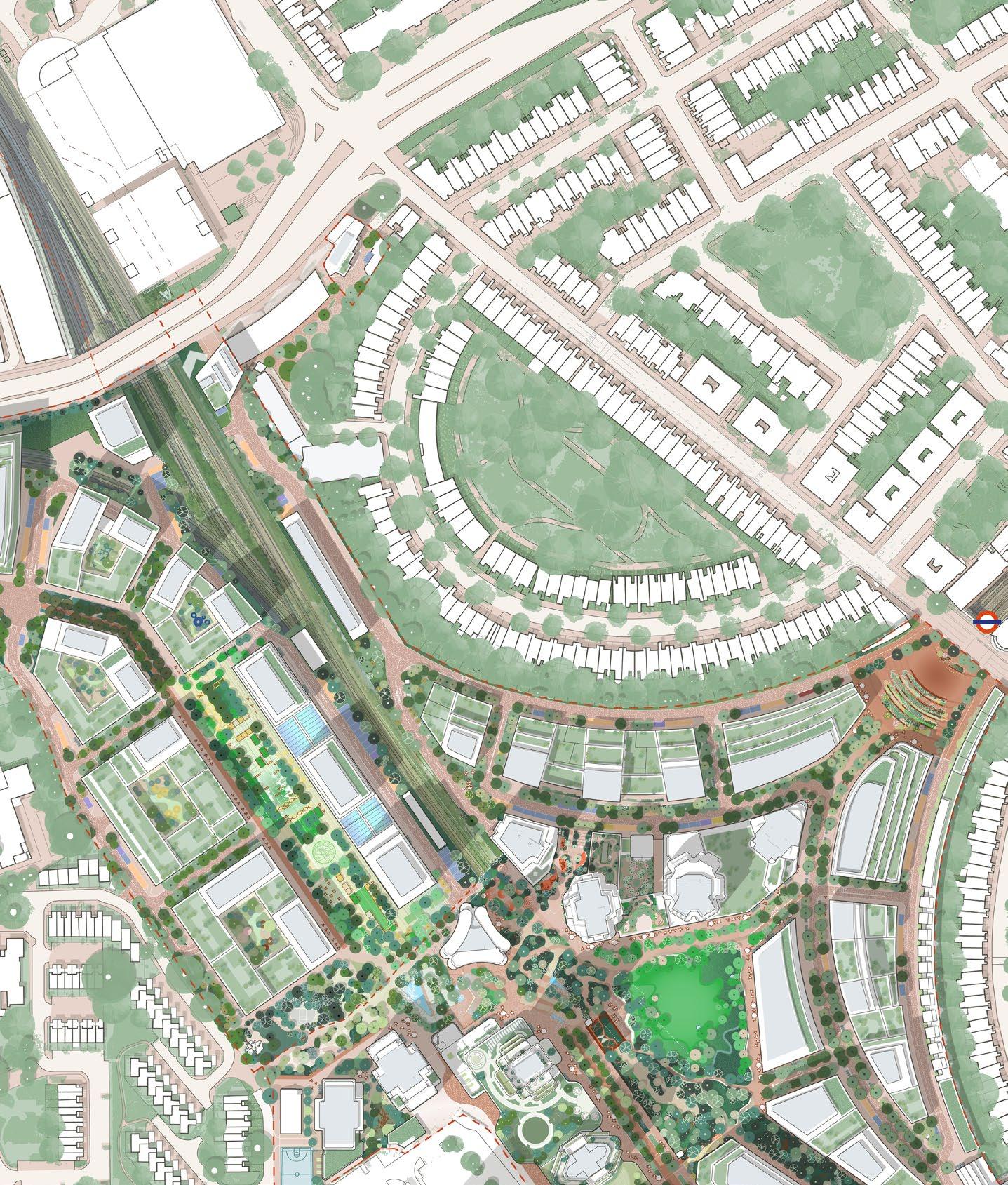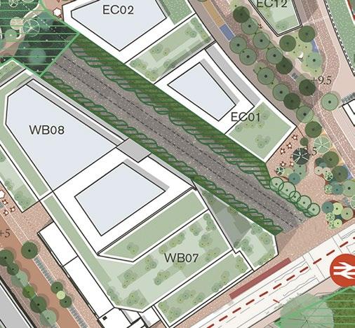 • A variety of studies for the treatment of the northern boundary were reviewed to agree an approach that could provide a holistic landscape and play proposal in the interim condition while also coordinating the public realm with future phases to minimise future disruption. Relevant design principles were added to the Design Code.