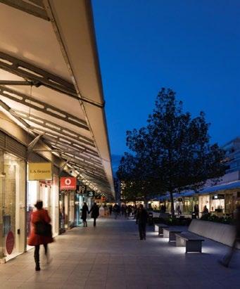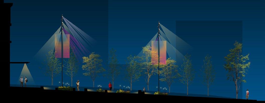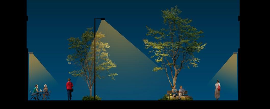 3. Selected trees at end s of street or key junctions lit from human-scale lighting columns fixed within adjacent planters.
