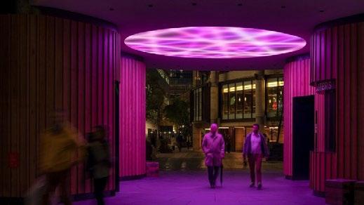 Public Realm spaces directly outside cultural venues can at times host the extension of the functions of those internal venues as people spill out into the adjacent space. There is an opportunity for some of the lighting in these areas to be influenced by the interior lighting, and matching coloured light between interiors and exteriors is one way to extend the vibrant internal atmosphere to the exterior. When such coloured light is used, it must only be done so during times in which the cultural interior spaces are in use.