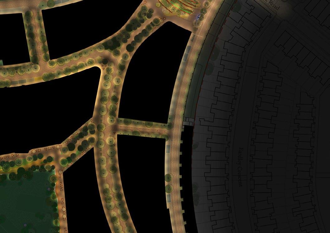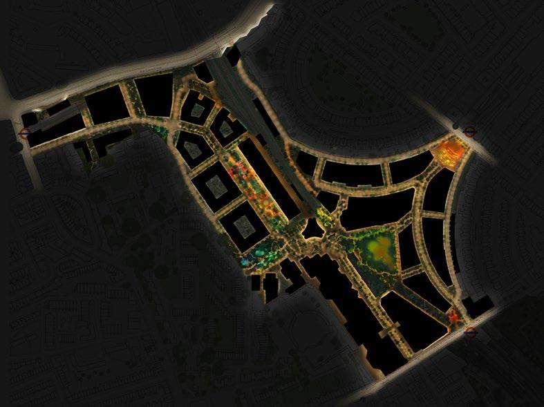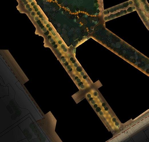 security and accessibility does not necessitate high light intensities and strong horizontal illuminance, but rather the selective illumination of key surfaces, forms, and details. The illumination of vertical surfaces, whether they be natural (e.g. trees) or man-made (e.g. architectural and landscape features) will be critical in revealing the proportions and boundaries of spaces across Earls Court after dark.