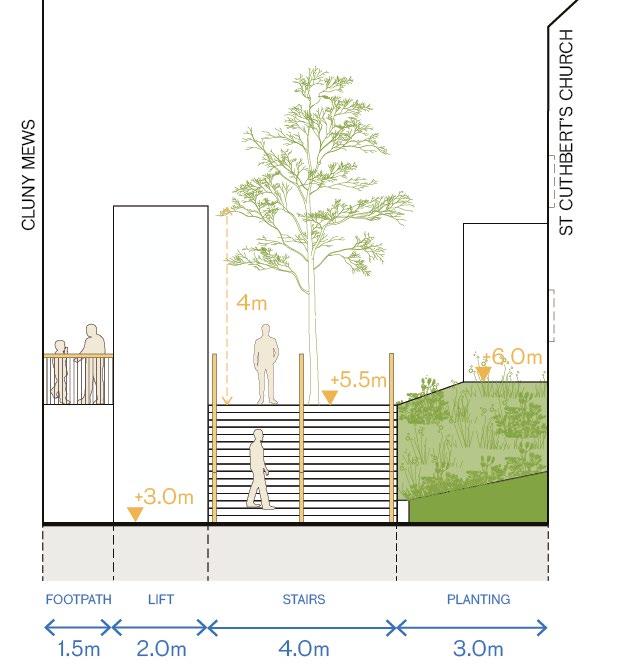 • Additional illustrative design was provided for the potential Cluny Mews connection which showed how the public realm in this location could be enhanced and made more legible.