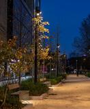 3. Selected trees and planters around square lit from human-scale lighting columns fixed within adjacent planters.