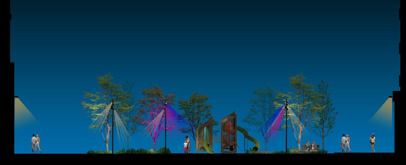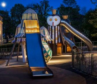 During the early evening period, coloured light can be used to bring particular attention to the character of spaces dedicated for play. Such coloured light may be integrated into play equipment itself or could be introduced with slight adjustments to the standard lighting equipment being used in adjacent areas.