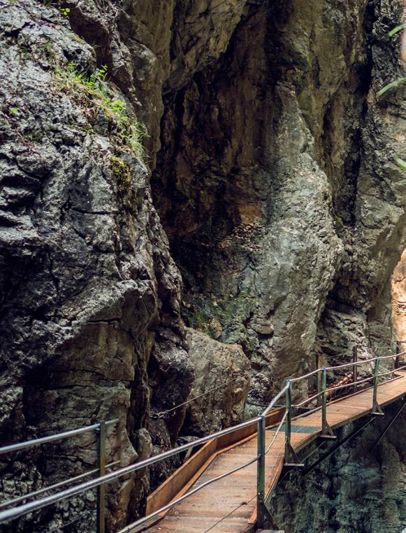 KARWENDELSCHLUCHT: Entlang schroffer Felsen, tosender Wasserfälle und unberührter Natur präsentiert sich die Karwendelschlucht von ihrer lebhaften Seite. Sie liegt unweit der kleinen Birzlkapelle direkt im namensgebenden Karwendeltal oberhalb von Scharnitz und ist von dort aus sogar bequem im Rahmen eines ausgedehnten Spazierganges erreichbar. Der aussichtsreiche Aufstieg belohnt unterwegs mit spektakulärem Weitblick über die zahllosen Gipfel und Seitentäler des größten Naturparks Österreichs.