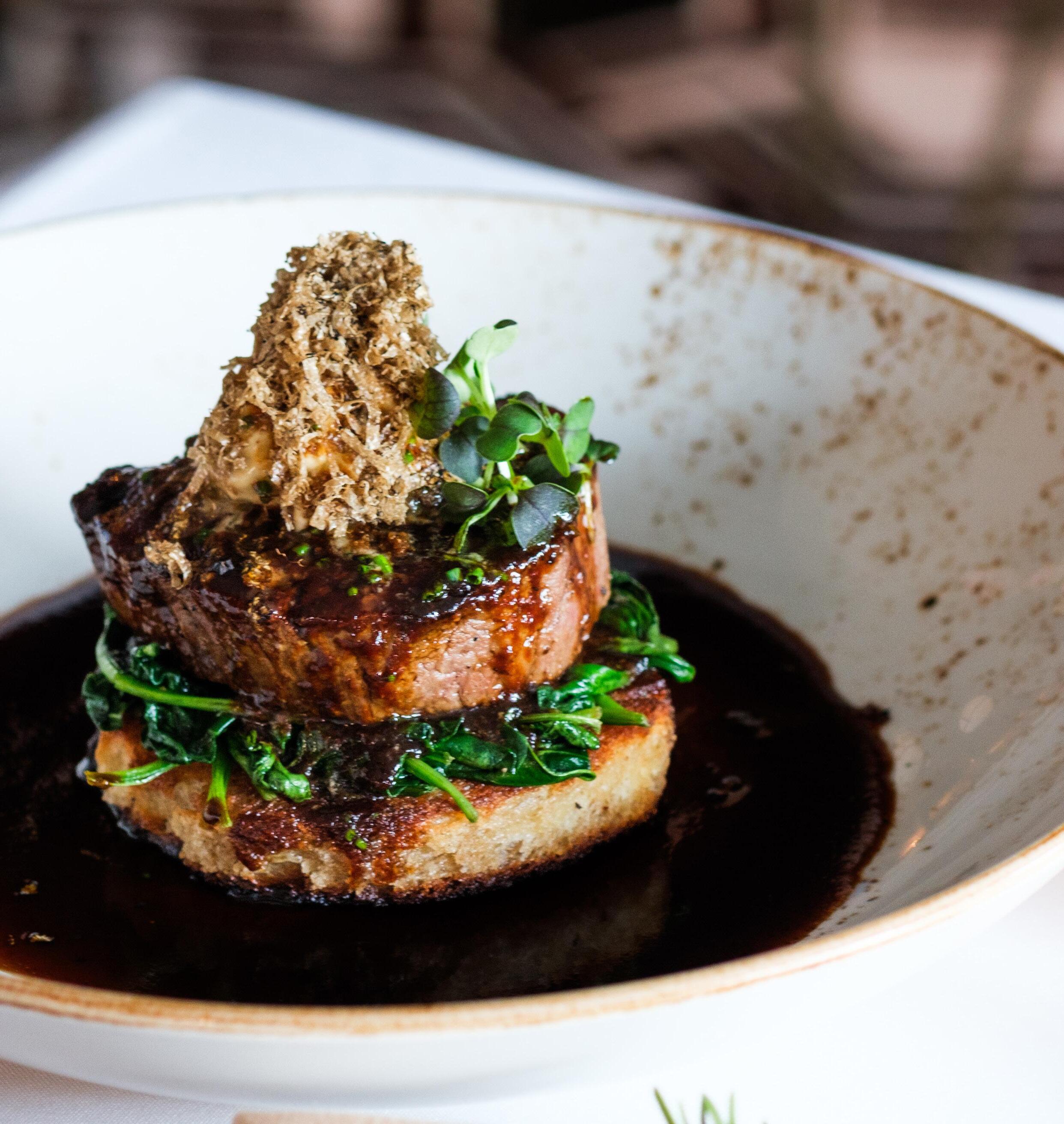 and mozzarella. Brussels sprouts arrive lacquered in a baked apple and peanut miso dressing, dusted with spiced cashews and Espelette pepper. The Filet Rossini is a dish close to Hassanali’s heart. His version features a 6 oz. filet nestled on toasted brioche and spinach glazed in a madeira wine sauce and topped with foie gras butter and fresh truffle.