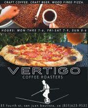 81 Fourth St., San Juan Bautista 831.623.9533 | vertigocoffee.com Specialty coffee roasters that also feature wood-fired cooking and craft beers.