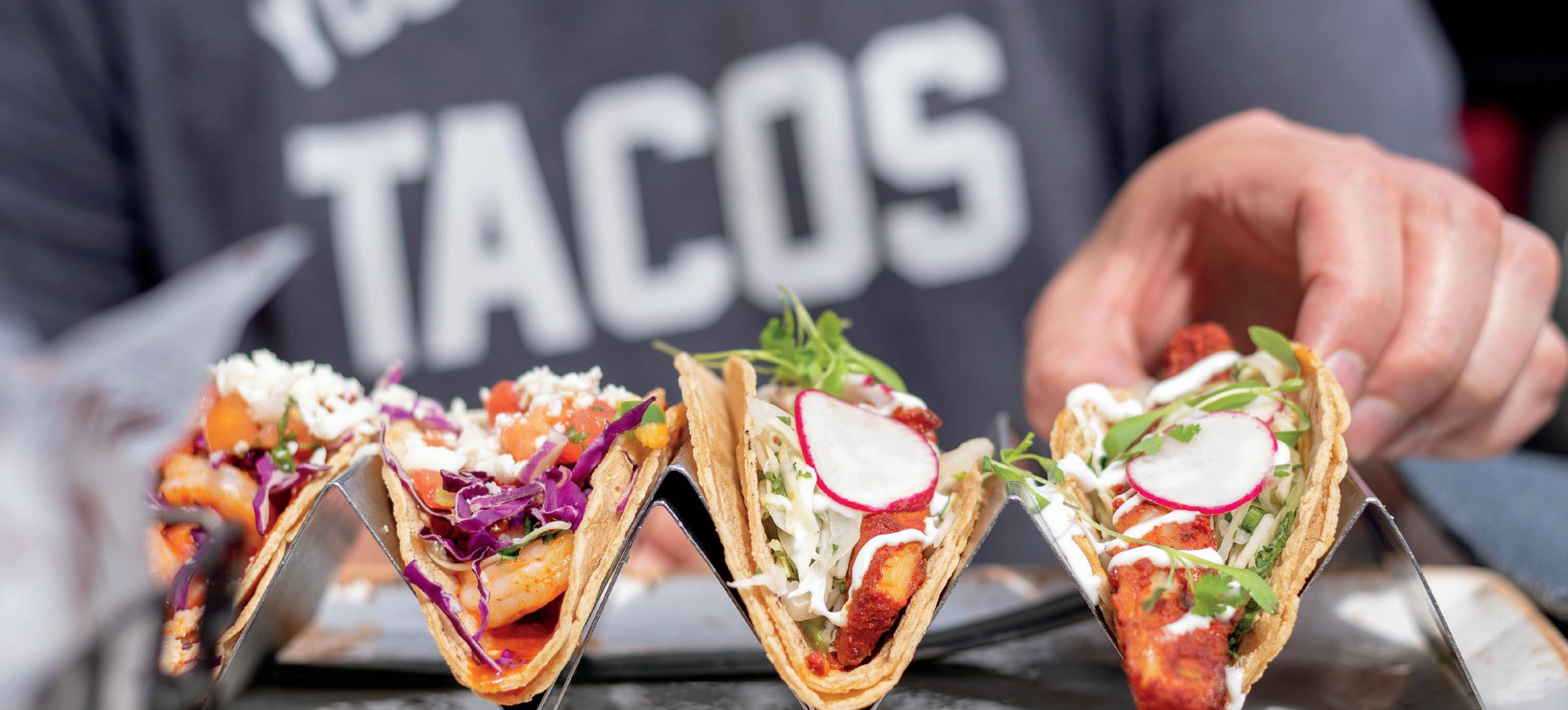 Left: Tacos and cocktails. Right: Customers in front of mural at The Skillet.