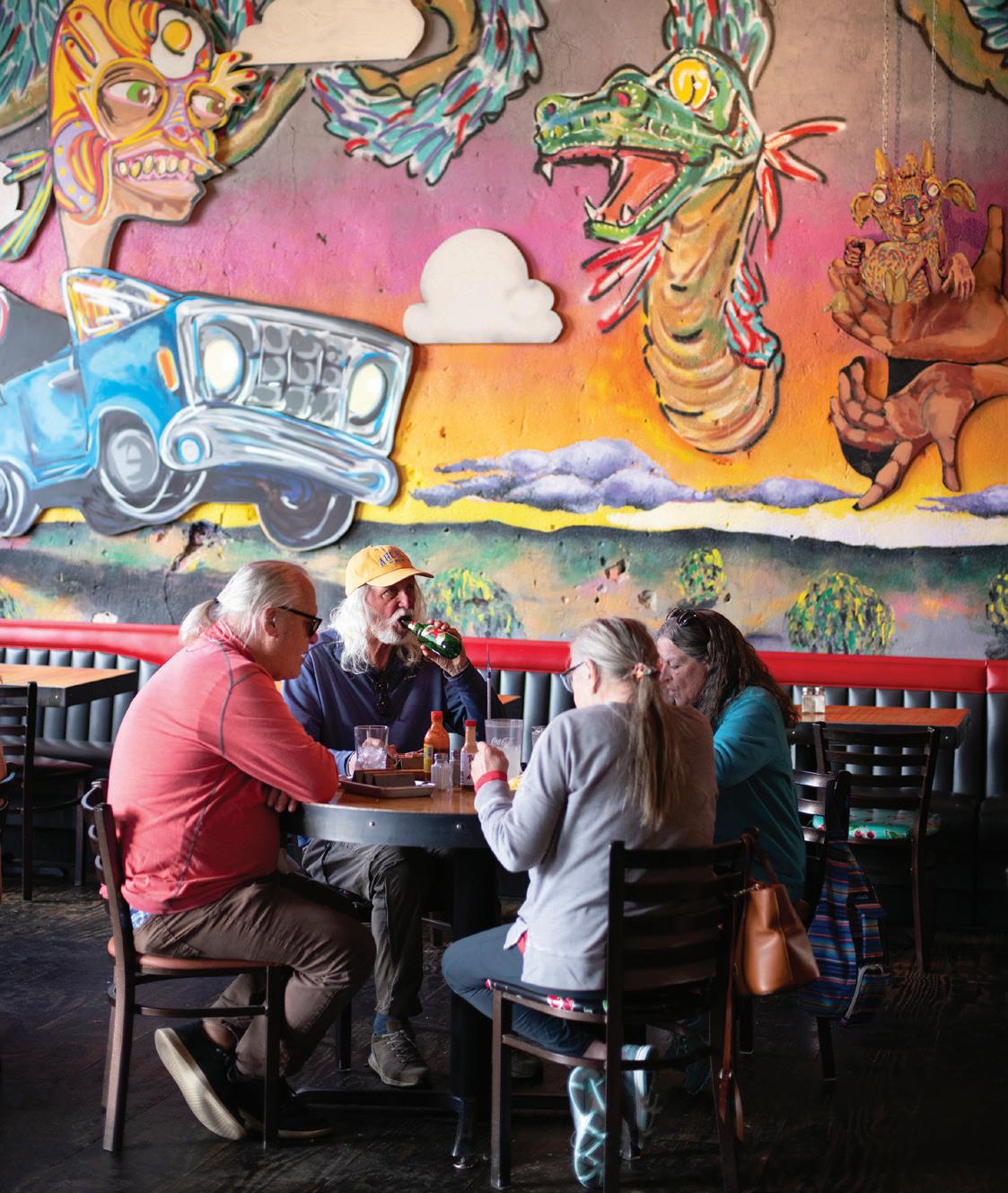 I love to watch people walk in for the first time. Although the restaurant business is strong in my blood, my artistic practice plays a major role in my daily life and at The Skillet. I invited NMHU Media Arts Club to help develop a set of projected animations over the existing murals and sculptures at the restaurant. What they came up with is really exciting and literally brings the room to life. The restaurant was built inside a ninety-nine-year-old building with great natural light, and the best time to see this installation is after sunset.