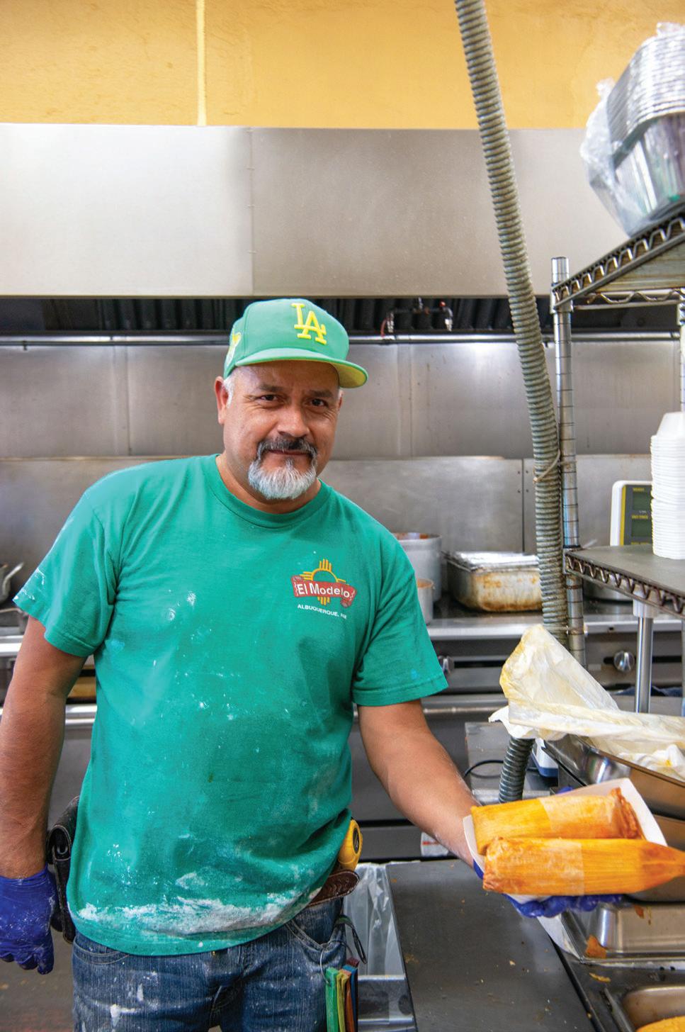 On the southeast side of Barelas, once known as Tortilla Flats, El Modelo’s vibrant signage and steady flow of customers stand out in an otherwise industrial area. According to the Barelas Historic Walking Tour, the building was one of three to survive an urban renewal project in the early 1970s, when more than two hundred homes were demolished. El Modelo opened in 1929 in a three-bedroom house at 1715 Second Street, selling tortillas and tamales out of a one-room “factory” until the family moved out and, on the same site, built the facility where curious customers can watch tamale production while waiting to place their orders. They are known for their meaty tamales but offer any and all New Mexican foods, from rolled enchiladas to