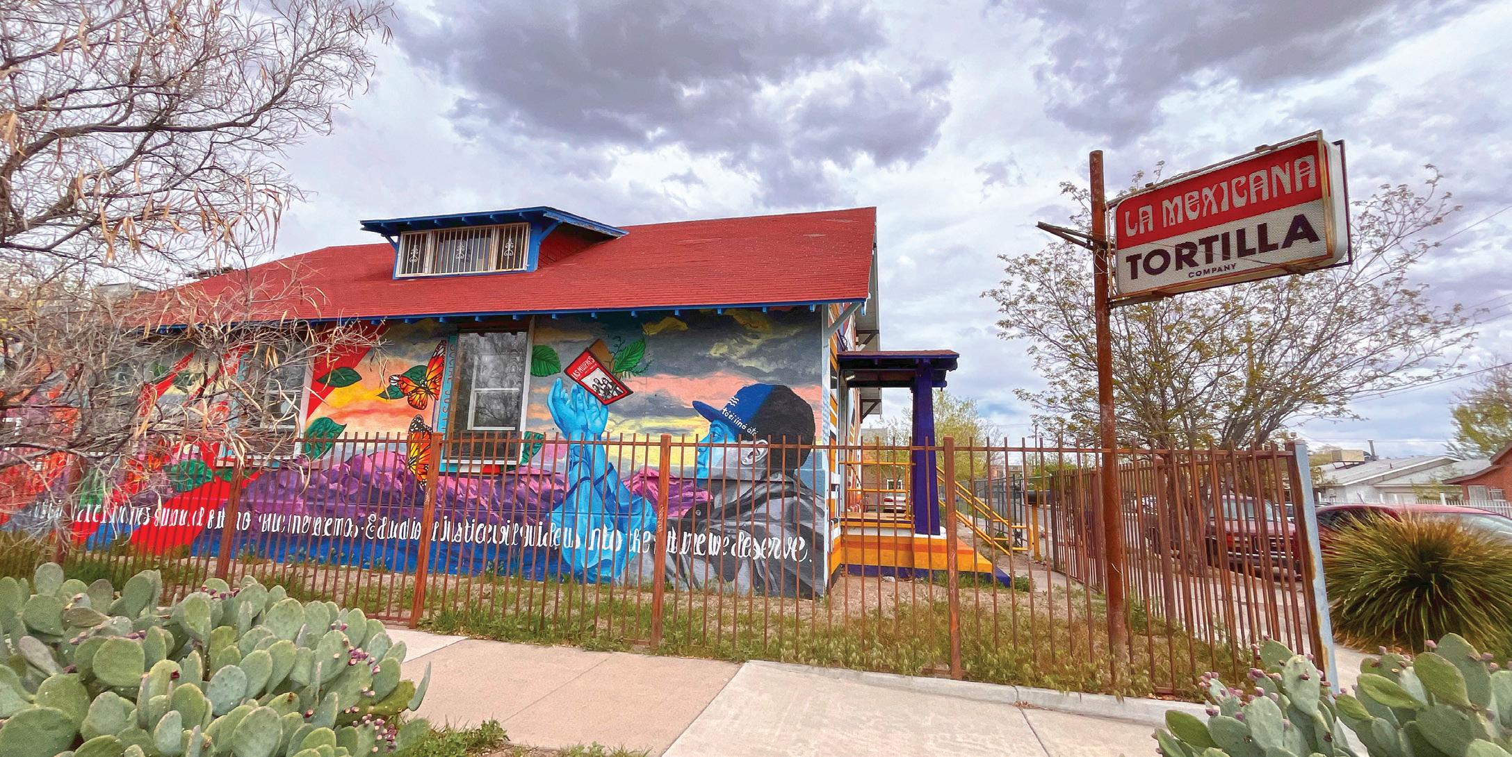 Today, Barelas is experiencing a renaissance, with spaces like the B Ruppe building becoming home to art galleries and event spaces and the rail yards being reinvented as a seasonal market (and occasional movie set). The drugstore, which moved in from Old Town in the 1960s, is now the Secret Gallery, with a micro museum in the back devoted to the history of the B Ruppe and the legacy of herbalist and curandera Maclovia Sanchez de Zamora. It is her elegant likeness that graces the outer north wall in a mural by Nanibah Chacon. Working Classroom, located in a space La Mexicana Tortilla