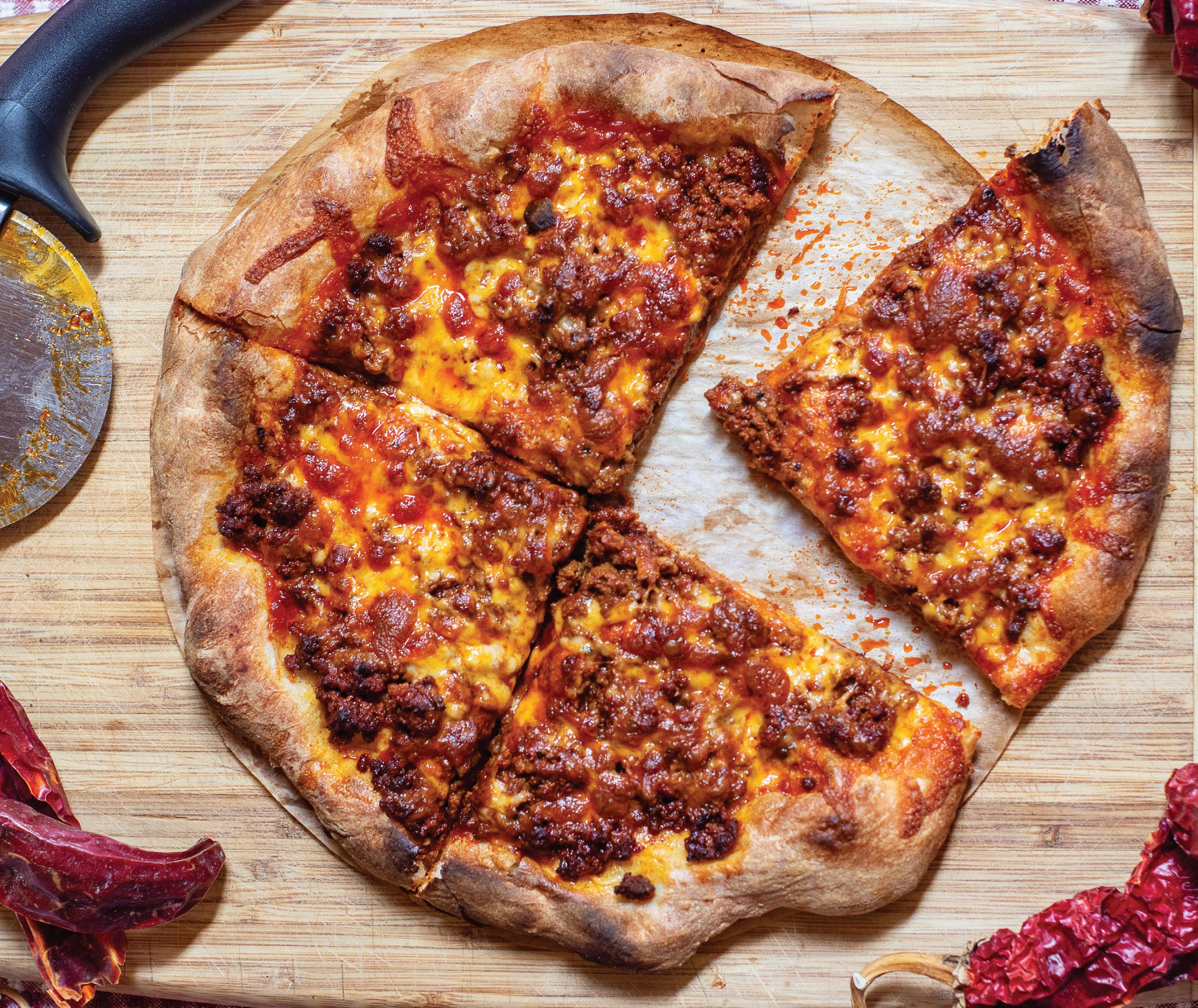 Season egg with salt and pepper, and drizzle chile oil on the finished pie. Break into the yolk and spread all over the pizza.