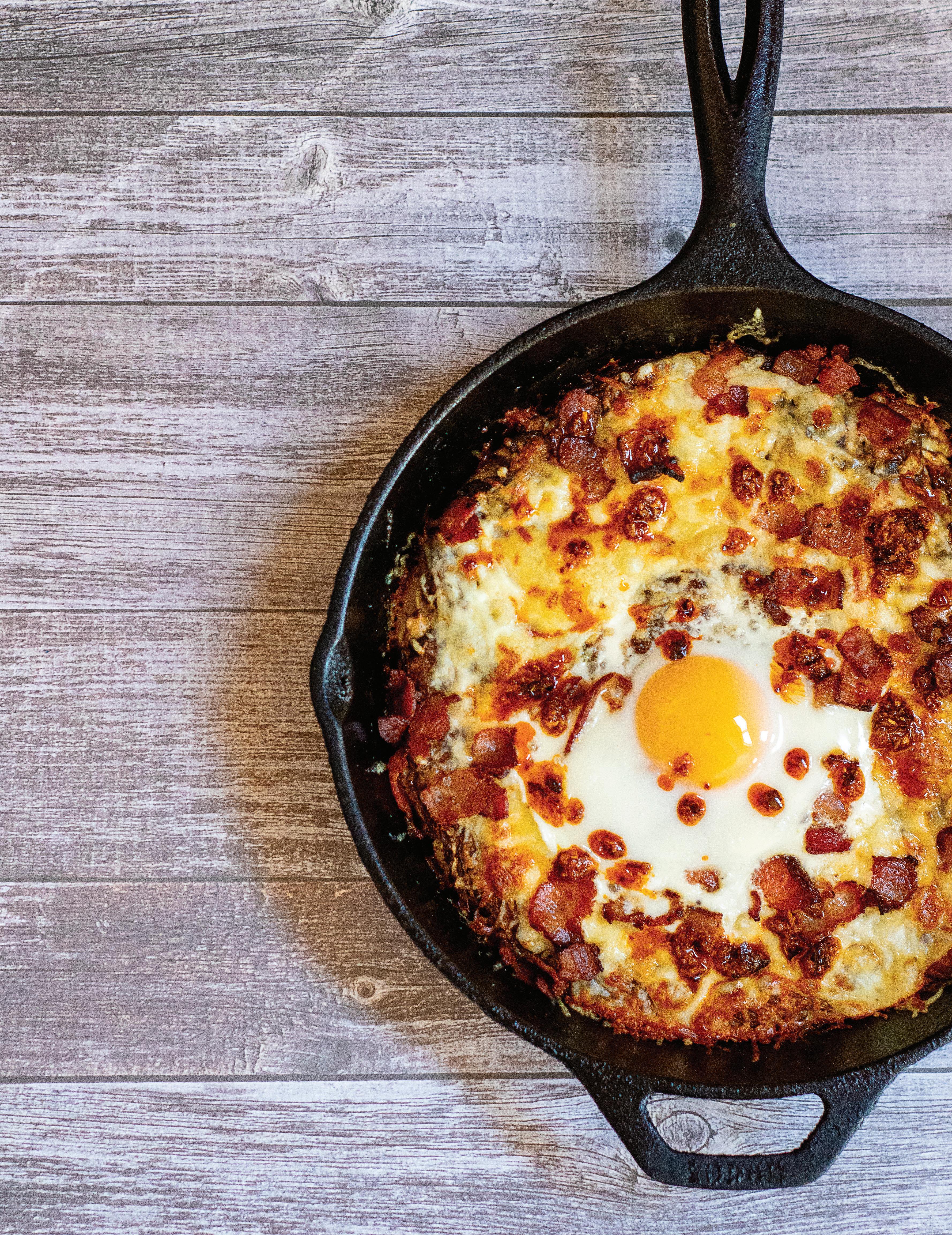 Place the skillet on the middle rack in the oven and bake for 4–5 minutes, until golden and melty. Remove from the oven and carefully crack an egg into the center of the pizza. Return the pizza to the oven and bake until the egg white is set but the yolk is still runny, 2–3 minutes.