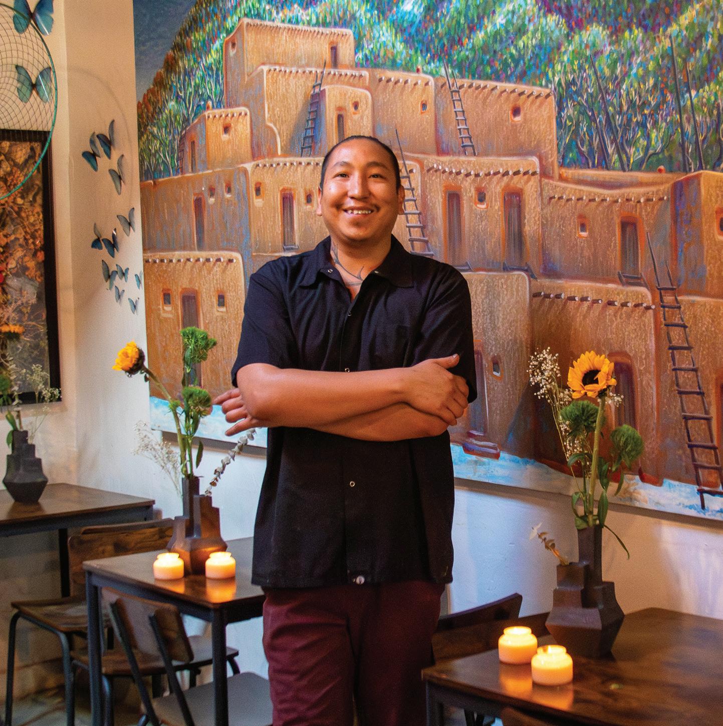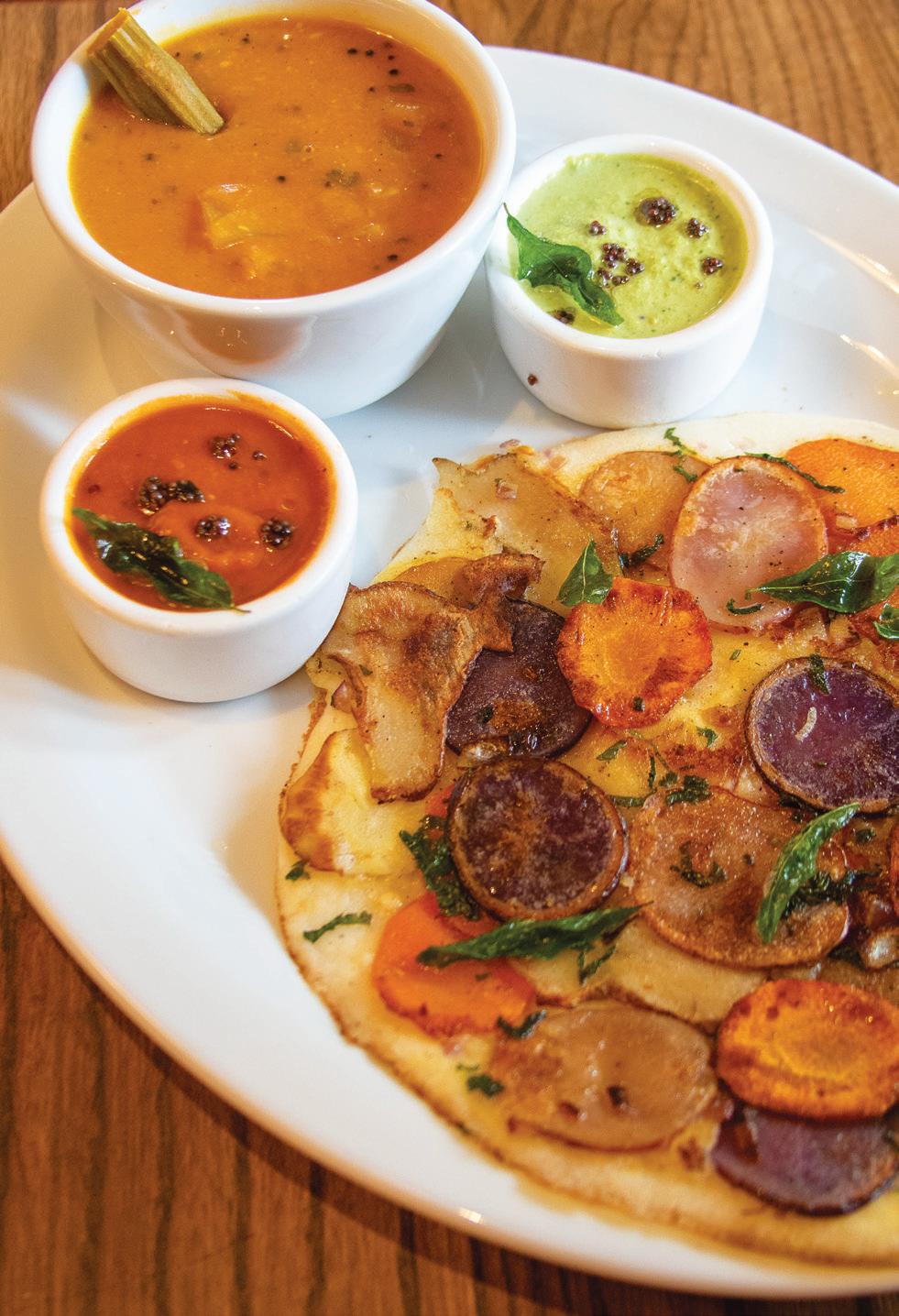 jobs at fine restaurants, he was recruited by a friend to work at Dosa in San Francisco, an upscale South Indian restaurant, which later brought him to Santa Fe and to his own restaurant, Paper Dosa. His philosophy in running the kitchen at Paper Dosa, where everything is made from scratch, is “Use high-quality ingredients, keep it simple and fresh, and use a diverse group of vegetables”—because that’s what brings the flavor.